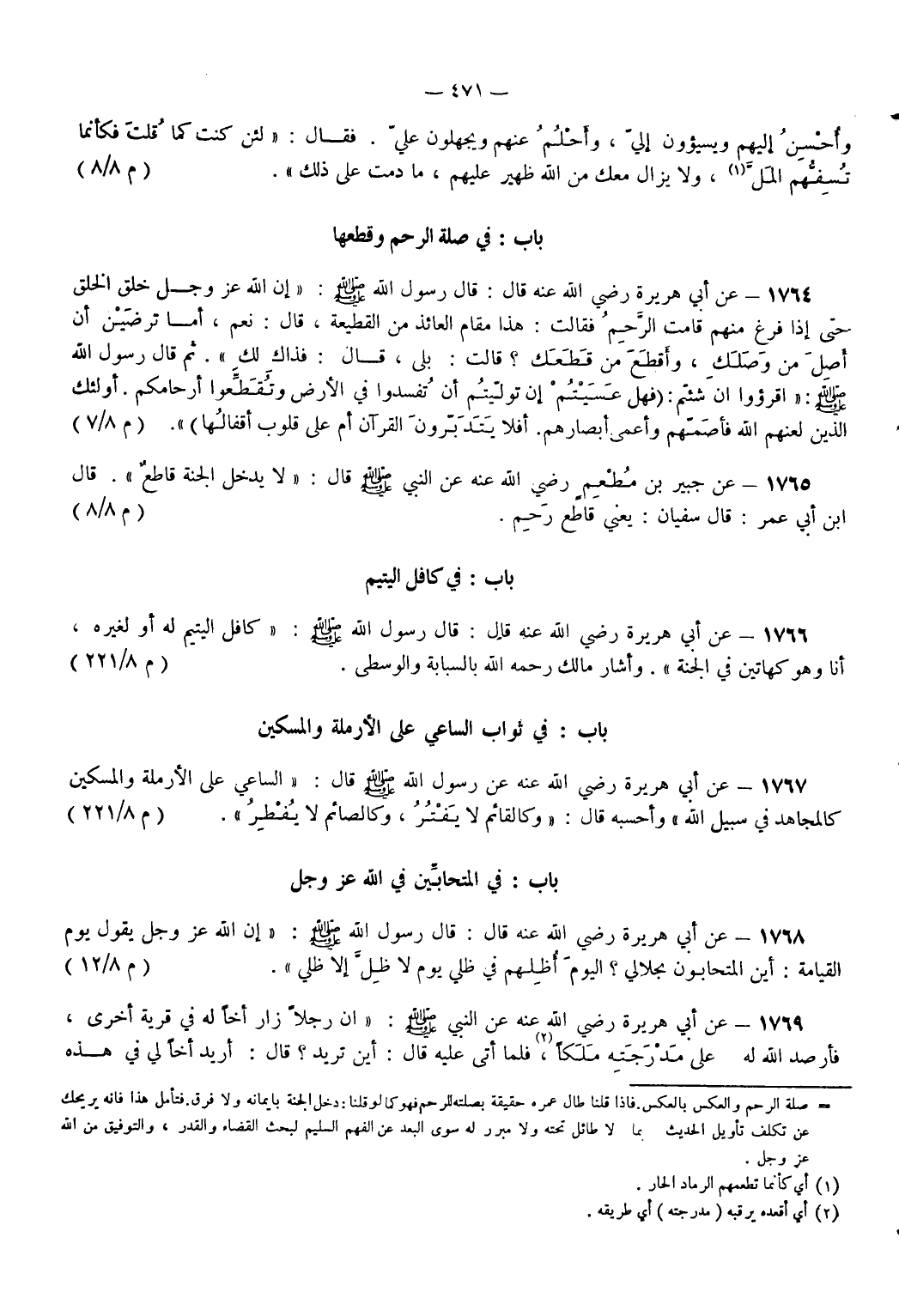1767 - عَنْ أَبِي هُرَيْرَةَ - رضي الله عنه - عَنْ رسول الله - صَلَّى اللَّهُ عَلَيْهِ وَسَلَّمَ - قَالَ السَّاعِي عَلَى الْأَرْمَلَةِ وَالْمِسْكِينِ كَالْمُجَاهِدِ فِي سَبِيلِ اللَّهِ وَأَحْسِبُهُ قَالَ وَكَالْقَائِمِ لَا يَفْتُرُ وَكَالصَّائِمِ لَا يُفْطِرُ. (م 8/ 221)