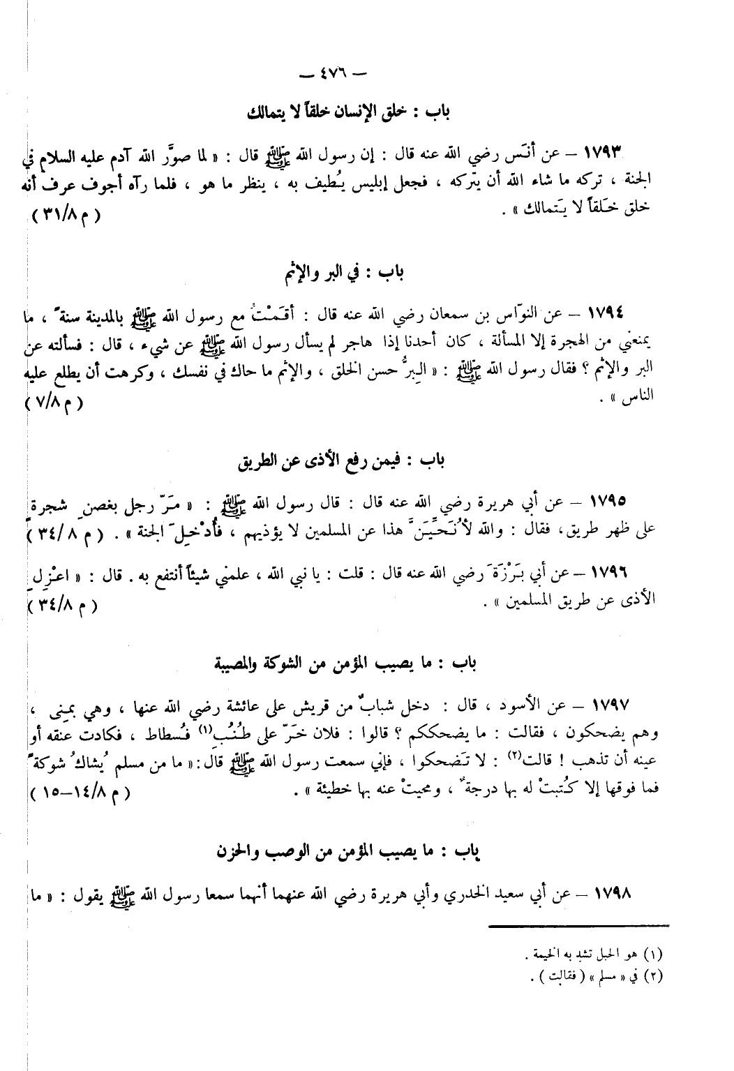 1795 - عَنْ أَبِي هُرَيْرَةَ - رضي الله عنه - قَالَ قَالَ رَسُولُ اللَّهِ - صَلَّى اللَّهُ عَلَيْهِ وَسَلَّمَ - مَرَّ رَجُلٌ بِغُصْنِ شَجَرَةٍ عَلَى ظَهْرِ طَرِيقٍ فَقَالَ وَاللَّهِ لَأُنَحِّيَنَّ هَذَا عَنْ الْمُسْلِمِينَ لَا يُؤْذِيهِمْ فَأُدْخِلَ الْجَنَّةَ. (م 8/ 34)