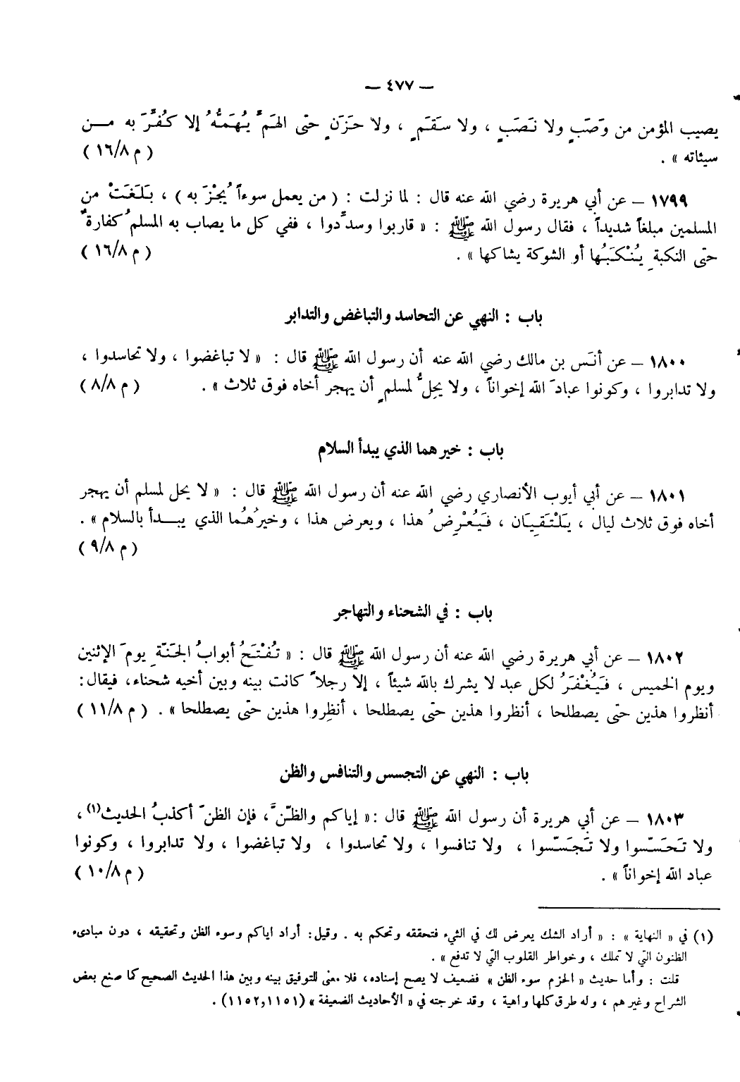 1803 - عَنْ أَبِي هُرَيْرَةَ أَنَّ رَسُولَ اللَّهِ - صَلَّى اللَّهُ عَلَيْهِ وَسَلَّمَ - قَالَ إِيَّاكُمْ وَالظَّنَّ فَإِنَّ الظَّنَّ أَكْذَبُ الْحَدِيثِ (¬1) وَلَا تَحَسَّسُوا وَلَا تَجَسَّسُوا وَلَا تَنَافَسُوا وَلَا تَحَاسَدُوا وَلَا تَبَاغَضُوا وَلَا تَدَابَرُوا وَكُونُوا عِبَادَ اللَّهِ إِخْوَانًا. (م 8/ 10)