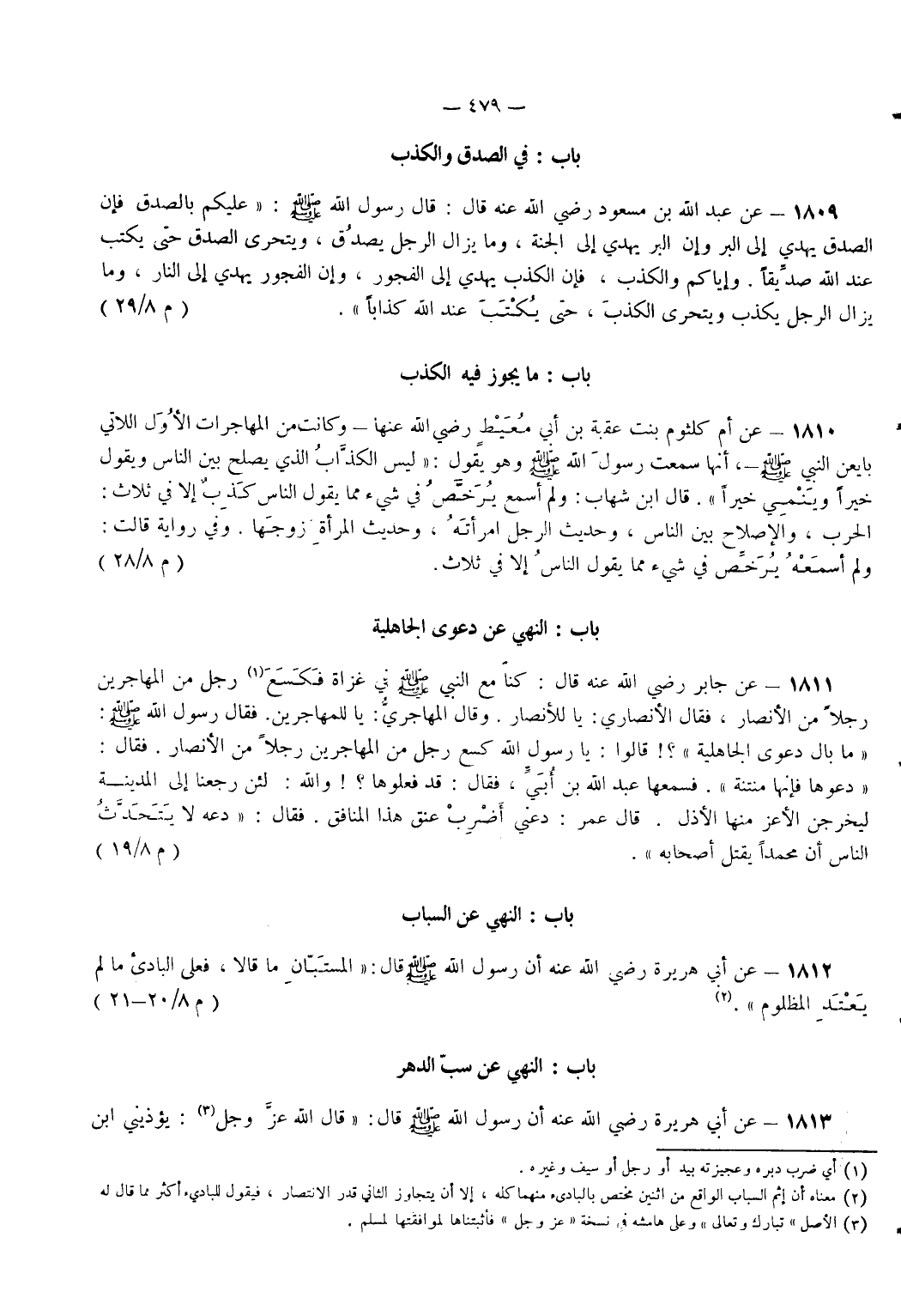 1809 - عَنْ عَبْدِ اللَّهِ بن مسعود - رضي الله عنه - قَالَ قَالَ رَسُولُ اللَّهِ - صَلَّى اللَّهُ عَلَيْهِ وَسَلَّمَ - عَلَيْكُمْ بِالصِّدْقِ فَإِنَّ الصِّدْقَ يَهْدِي إِلَى الْبِرِّ وَإِنَّ الْبِرَّ يَهْدِي إِلَى الْجَنَّةِ وَمَا يَزَالُ الرَّجُلُ يَصْدُقُ وَيَتَحَرَّى الصِّدْقَ حَتَّى يُكْتَبَ عِنْدَ اللَّهِ صِدِّيقًا وَإِيَّاكُمْ وَالْكَذِبَ فَإِنَّ الْكَذِبَ يَهْدِي إِلَى الْفُجُورِ وَإِنَّ الْفُجُورَ يَهْدِي إِلَى النَّارِ وَمَا يَزَالُ الرَّجُلُ يَكْذِبُ وَيَتَحَرَّى الْكَذِبَ حَتَّى يُكْتَبَ عِنْدَ اللَّهِ كَذَّابًا. (م 8/ 29)