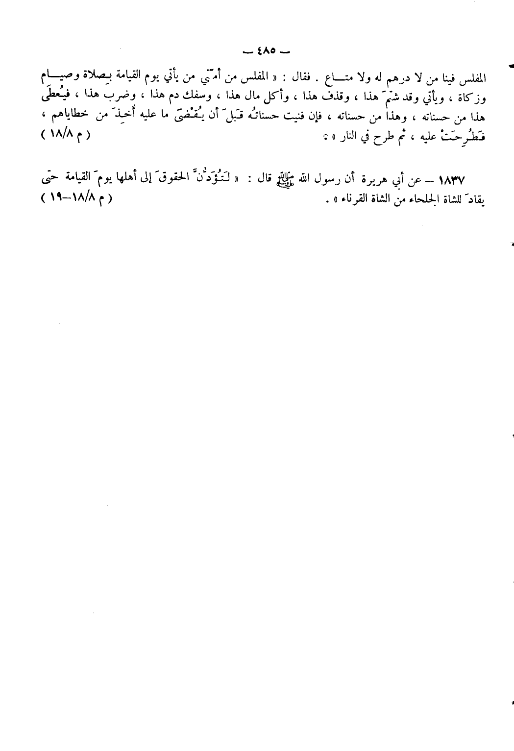 1837 - عَنْ أَبِي هُرَيْرَةَ أَنَّ رَسُولَ اللَّهِ - صَلَّى اللَّهُ عَلَيْهِ وَسَلَّمَ - قَالَ لَتُؤَدُّنَّ الْحُقُوقَ إِلَى أَهْلِهَا يَوْمَ الْقِيَامَةِ حَتَّى يُقَادَ لِلشَّاةِ الْجَلْحَاءِ مِنْ الشَّاةِ الْقَرْنَاءِ. (م 8/ 18 - 19)
