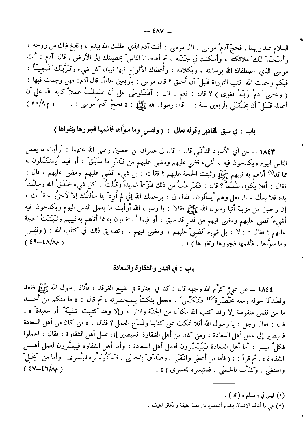 السلام عِنْدَ رَبِّهِمَا فَحَجَّ آدَمُ مُوسَى قَالَ مُوسَى أَنْتَ آدَمُ الَّذِي خَلَقَكَ اللَّهُ بِيَدِهِ وَنَفَخَ فِيكَ مِنْ رُوحِهِ وَأَسْجَدَ لَكَ مَلَائِكَتَهُ وَأَسْكَنَكَ فِي جَنَّتِهِ ثُمَّ أَهْبَطْتَ النَّاسَ بِخَطِيئَتِكَ إِلَى الْأَرْضِ فَقَالَ آدَمُ أَنْتَ مُوسَى الَّذِي اصْطَفَاكَ اللَّهُ بِرِسَالَتِهِ وَبِكَلَامِهِ وَأَعْطَاكَ الْأَلْوَاحَ فِيهَا تِبْيَانُ كُلِّ شَيْءٍ وَقَرَّبَكَ نَجِيًّا فَبِكَمْ وَجَدْتَ اللَّهَ كَتَبَ التَّوْرَاةَ قَبْلَ أَنْ أُخْلَقَ قَالَ مُوسَى بِأَرْبَعِينَ عَامًا قَالَ آدَمُ فَهَلْ وَجَدْتَ فِيهَا (وَعَصَى آدَمُ رَبَّهُ فَغَوَى) قَالَ نَعَمْ قَالَ أَفَتَلُومُنِي عَلَى أَنْ عَمِلْتُ عَمَلًا كَتَبَهُ اللَّهُ عَلَيَّ أَنْ أَعْمَلَهُ قَبْلَ أَنْ يَخْلُقَنِي بِأَرْبَعِينَ سَنَةً قَالَ رَسُولُ اللَّهِ - صَلَّى اللَّهُ عَلَيْهِ وَسَلَّمَ - فَحَجَّ آدَمُ مُوسَى. (م 8/ 50)