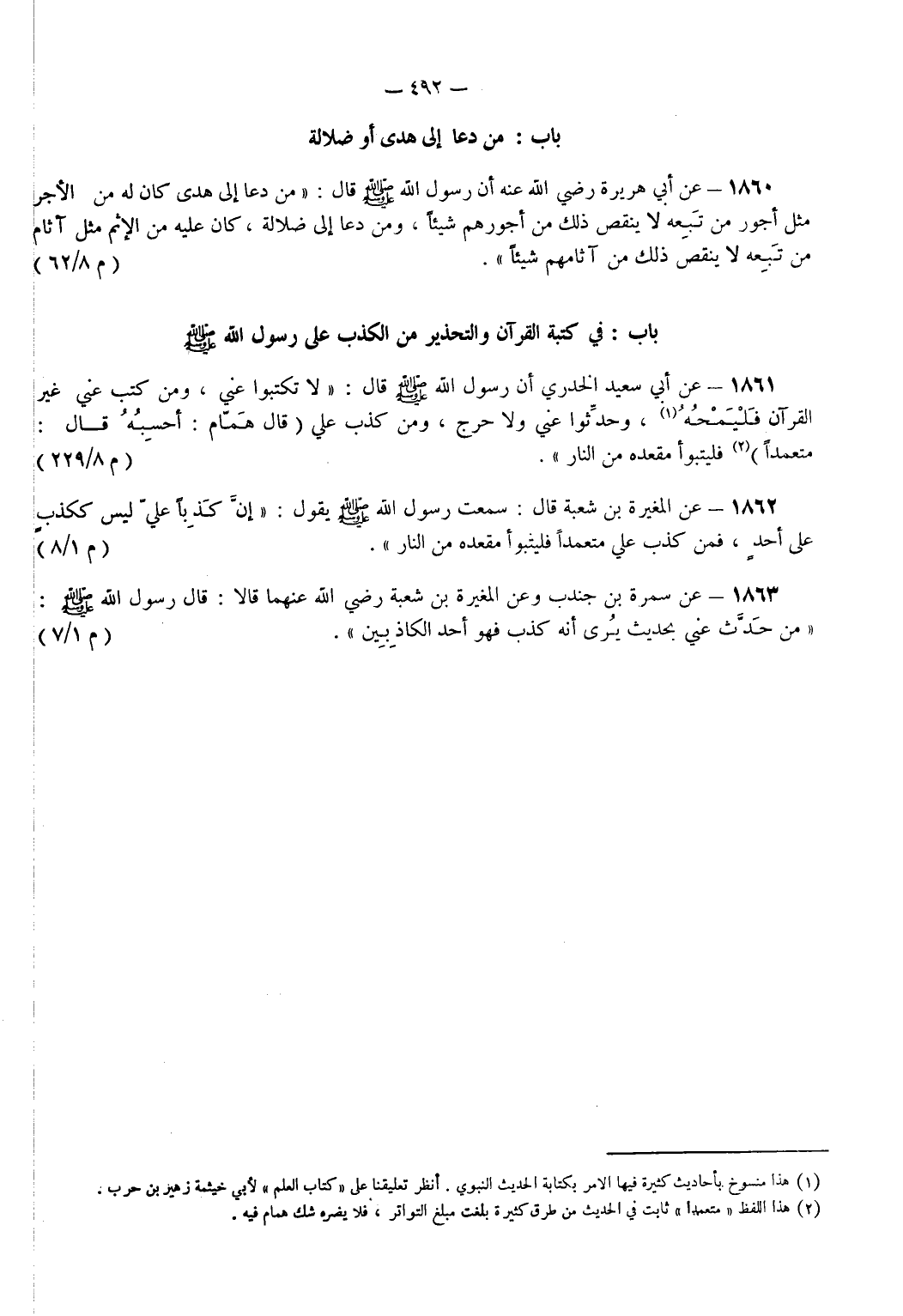 1863 - عَنْ سَمُرَةَ بْنِ جُنْدَبٍ وعن الْمُغِيرَةِ بْنِ شُعْبَةَ - رضي الله عنهما - قَالَا قَالَ: رَسُولِ اللَّهِ - صَلَّى اللَّهُ عَلَيْهِ وَسَلَّمَ - مَنْ حَدَّثَ عَنِّي بِحَدِيثٍ يُرَى أَنَّهُ كَذِبٌ فَهُوَ أَحَدُ الْكَاذِبِينَ. (م 1/ 7)