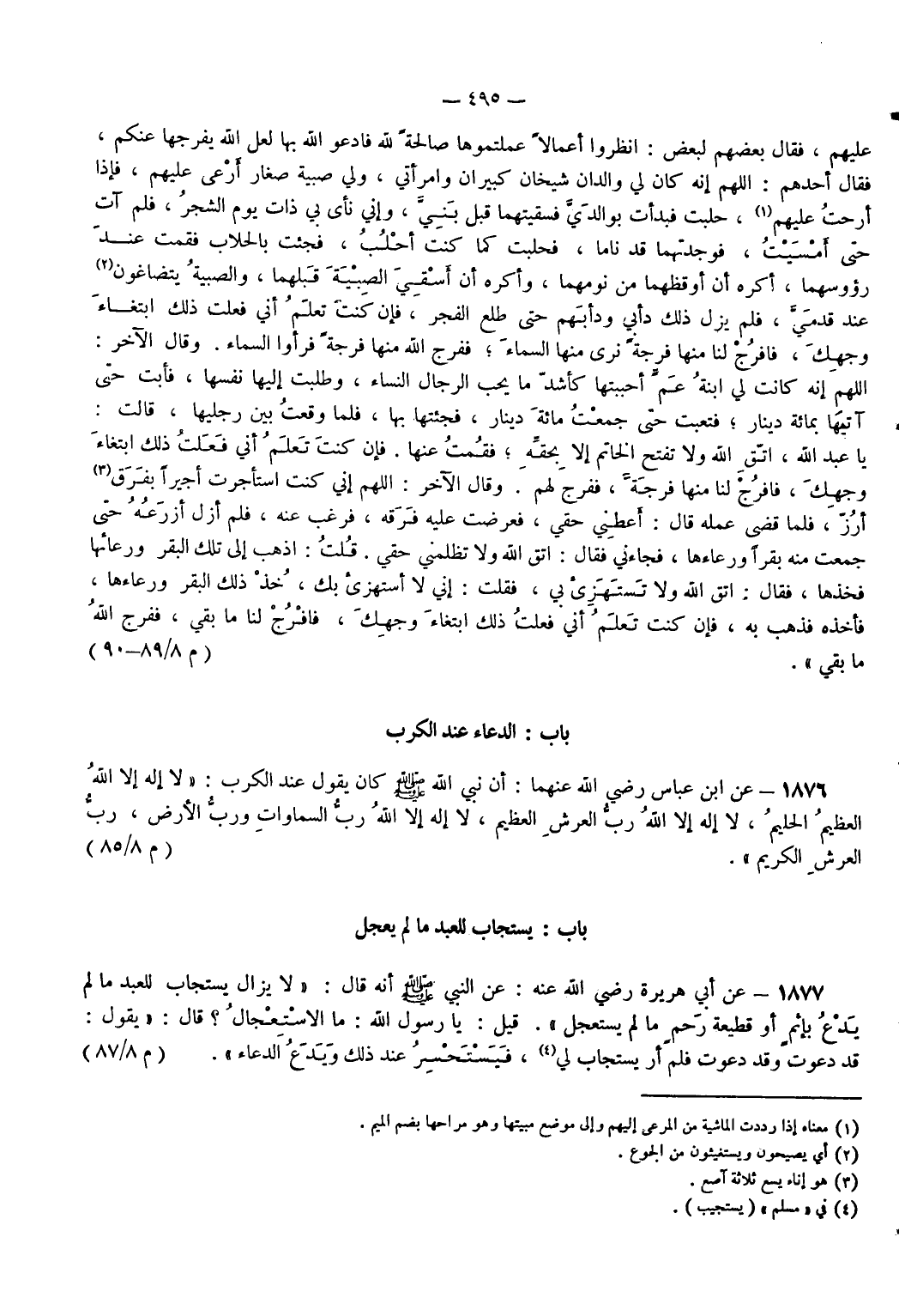 1877 - عَنْ أَبِي هُرَيْرَةَ - رضي الله عنه - عَنْ النَّبِيِّ - صَلَّى اللَّهُ عَلَيْهِ وَسَلَّمَ - أَنَّهُ قَالَ لَا يَزَالُ يُسْتَجَابُ لِلْعَبْدِ مَا لَمْ يَدْعُ بِإِثْمٍ أَوْ قَطِيعَةِ رَحِمٍ مَا لَمْ يَسْتَعْجِلْ قِيلَ يَا رَسُولَ اللَّهِ مَا الِاسْتِعْجَالُ قَالَ يَقُولُ قَدْ دَعَوْتُ وَقَدْ دَعَوْتُ فَلَمْ أَرَ يَسْتَجِابُ لِي (¬4) فَيَسْتَحْسِرُ عِنْدَ ذَلِكَ وَيَدَعُ الدُّعَاءَ. (م 8/ 87)