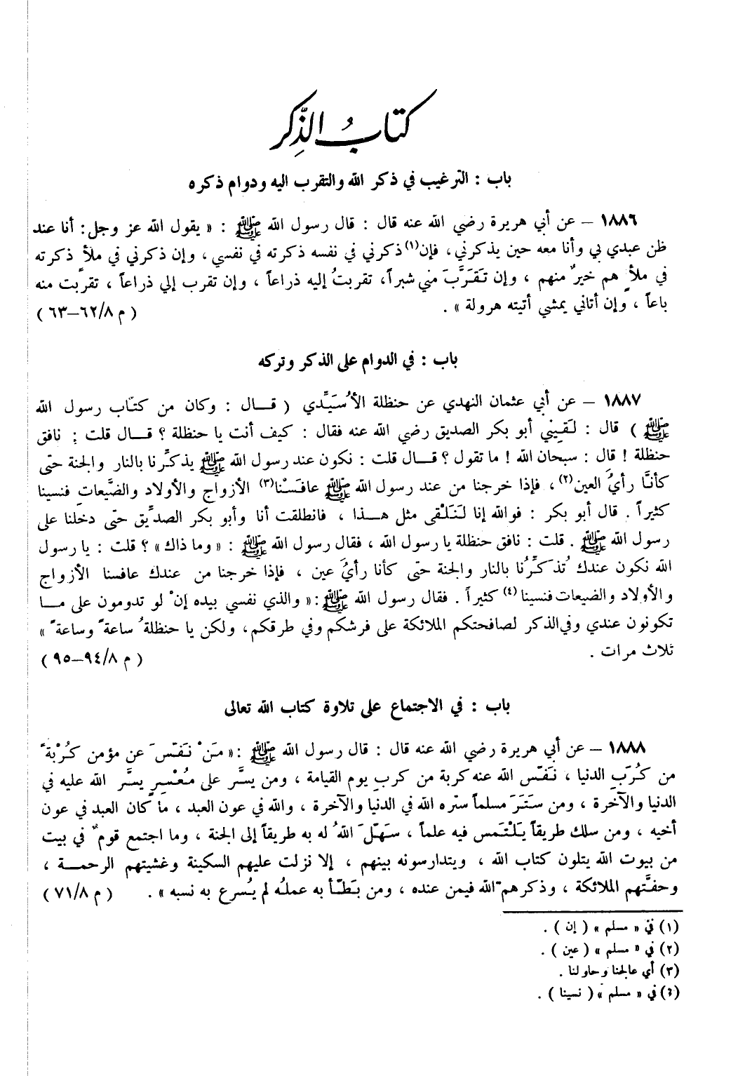 1887 - عَنْ أَبِي عُثْمَانَ النَّهْدِيِّ عَنْ حَنْظَلَةَ الْأُسَيِّدِيِّ قَالَ وَكَانَ مِنْ كُتَّابِ رَسُولِ اللَّهِ - صَلَّى اللَّهُ عَلَيْهِ وَسَلَّمَ - قَالَ لَقِيَنِي أَبُو بَكْر الصديق - رضي الله عنه - فَقَالَ كَيْفَ أَنْتَ يَا حَنْظَلَةُ قَالَ قُلْتُ نَافَقَ حَنْظَلَةُ قَالَ سُبْحَانَ اللَّهِ مَا تَقُولُ قَالَ قُلْتُ نَكُونُ عِنْدَ رَسُولِ اللَّهِ - صَلَّى اللَّهُ عَلَيْهِ وَسَلَّمَ - يُذَكِّرُنَا بِالنَّارِ وَالْجَنَّةِ حَتَّى كَأَنَّا رَأْيُ العَيْنٍ (¬2) فَإِذَا خَرَجْنَا مِنْ عِنْدِ رَسُولِ اللَّهِ - صَلَّى اللَّهُ عَلَيْهِ وَسَلَّمَ - عَافَسْنَا (¬3) الْأَزْوَاجَ وَالْأَوْلَادَ وَالضَّيْعَاتِ فَنَسِينَا كَثِيرًا قَالَ أَبُو بَكْرٍ فَوَاللَّهِ إِنَّا لَنَلْقَى مِثْلَ هَذَا فَانْطَلَقْتُ أَنَا وَأَبُو بَكْرٍ حَتَّى دَخَلْنَا عَلَى رَسُولِ اللَّهِ - صَلَّى اللَّهُ عَلَيْهِ وَسَلَّمَ - قُلْتُ نَافَقَ حَنْظَلَةُ يَا رَسُولَ اللَّهِ فَقَالَ رَسُولُ اللَّهِ - صَلَّى اللَّهُ عَلَيْهِ وَسَلَّمَ - وَمَا ذَاكَ قُلْتُ يَا رَسُولَ اللَّهِ نَكُونُ عِنْدَكَ تُذَكِّرُنَا بِالنَّارِ وَالْجَنَّةِ حَتَّى كَأَنَّا رَأْيُ عَيْنٍ فَإِذَا خَرَجْنَا مِنْ عِنْدِكَ عَافَسْنَا الْأَزْوَاجَ وَالْأَوْلَادَ وَالضَّيْعَاتِ فنَسِينَا (¬4) كَثِيرًا فَقَالَ رَسُولُ اللَّهِ - صَلَّى اللَّهُ عَلَيْهِ وَسَلَّمَ - وَالَّذِي نَفْسِي بِيَدِهِ إِنْ لَوْ تَدُومُونَ عَلَى مَا تَكُونُونَ عِنْدِي وَفِي الذِّكْرِ لَصَافَحَتْكُمْ الْمَلَائِكَةُ عَلَى فُرُشِكُمْ وَفِي طُرُقِكُمْ وَلَكِنْ يَا حَنْظَلَةُ سَاعَةً وَسَاعَةً ثَلَاثَ مَرَّاتٍ. (م 8/ 94 - 95)