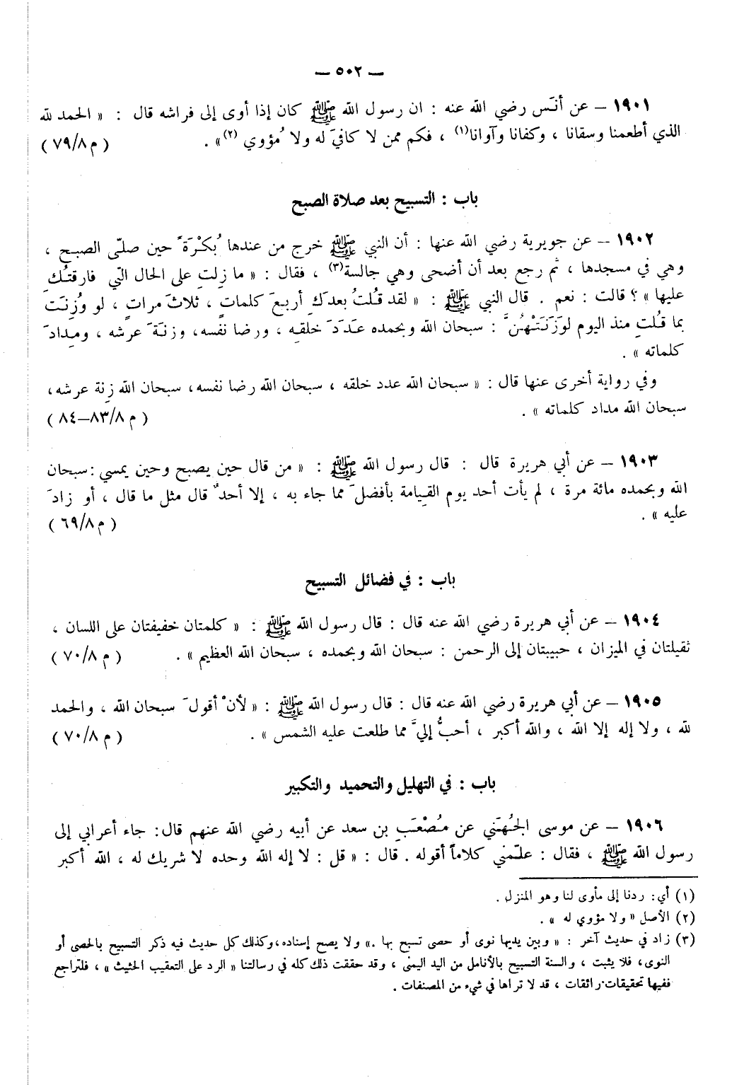 وفي رواية أخرى عَنها: قَالَ سُبْحَانَ اللَّهِ عَدَدَ خَلْقِهِ سُبْحَانَ اللَّهِ رِضَا نَفْسِهِ سُبْحَانَ اللَّهِ زِنَةَ عَرْشِهِ سُبْحَانَ اللَّهِ مِدَادَ كَلِمَاتِهِ. (م 8/ 83 - 84)