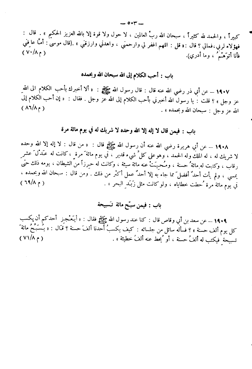 1907 - عَنْ أَبِي ذَرٍّ - رضي الله عنه - قَالَ قَالَ رَسُولُ اللَّهِ - صَلَّى اللَّهُ عَلَيْهِ وَسَلَّمَ - أَلَا أُخْبِرُكَ بِأَحَبِّ الْكَلَامِ إِلَى اللَّهِ عز وجل قُلْتُ يَا رَسُولَ اللَّهِ أَخْبِرْنِي بِأَحَبِّ الْكَلَامِ إِلَى اللَّهِ عز وجل فَقَالَ إِنَّ أَحَبَّ الْكَلَامِ إِلَى اللَّهِ عز وجل سُبْحَانَ اللَّهِ وَبِحَمْدِهِ. (م 8/ 86)