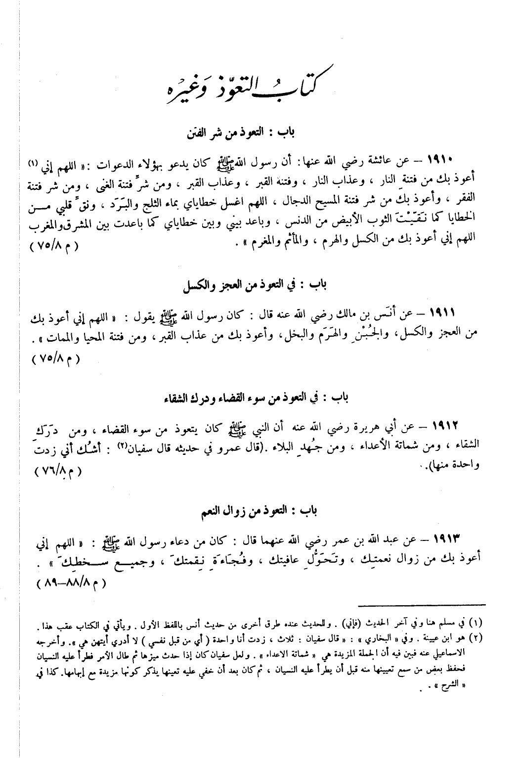 1913 - عَنْ عَبْدِ اللَّهِ بْنِ عُمَرَ - رضي الله عنهما - قَالَ كَانَ مِنْ دُعَاءِ رَسُولِ اللَّهِ - صَلَّى اللَّهُ عَلَيْهِ وَسَلَّمَ - اللَّهُمَّ إِنِّي أَعُوذُ بِكَ مِنْ زَوَالِ نِعْمَتِكَ وَتَحَوُّلِ عَافِيَتِكَ وَفُجَاءَةِ نِقْمَتِكَ وَجَمِيعِ سَخَطِكَ. (م 8/ 88 - 89)