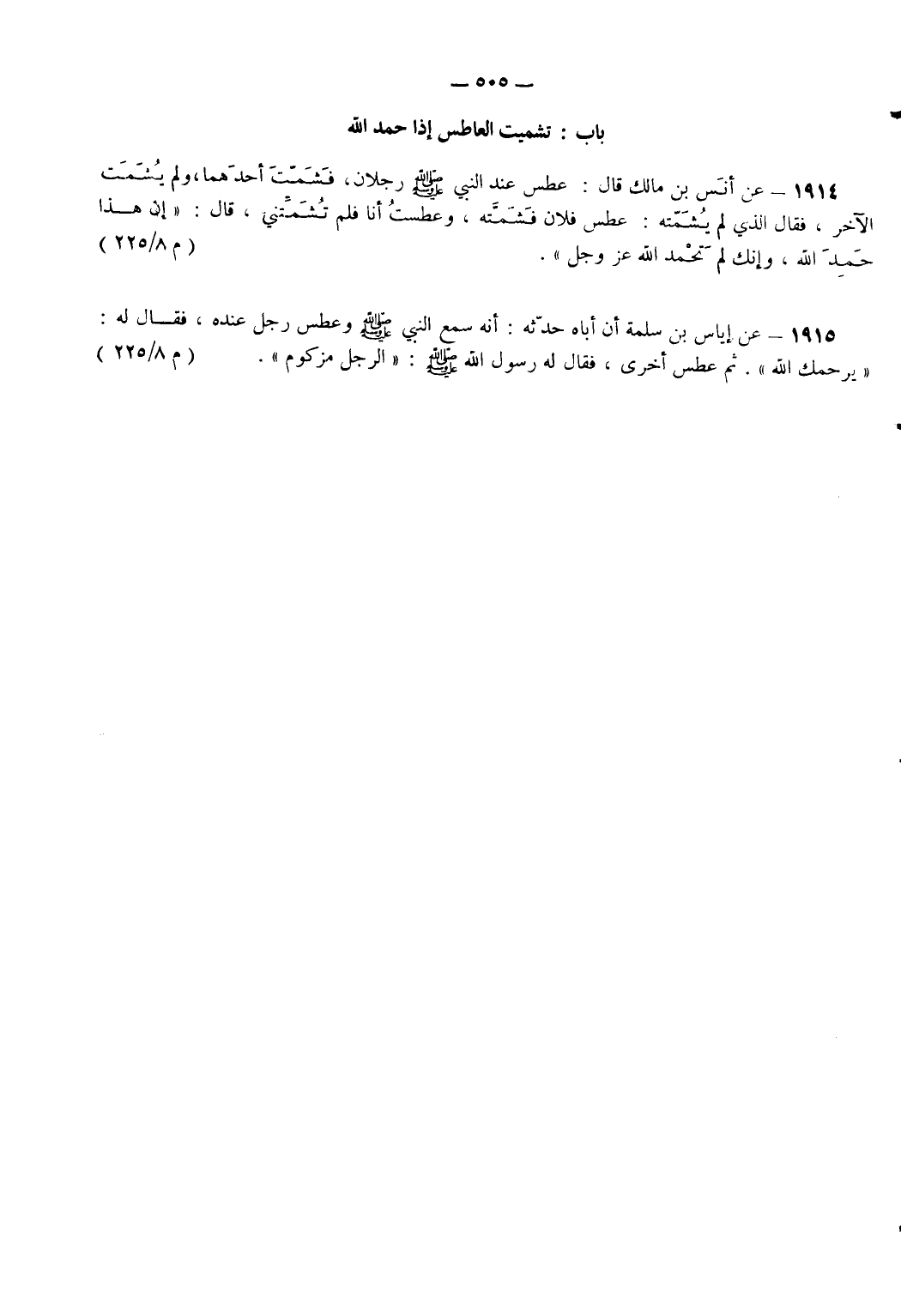 1914 - عَنْ أَنَسِ بْنِ مَالِكٍ قَالَ عَطَسَ عِنْدَ النَّبِيِّ - صَلَّى اللَّهُ عَلَيْهِ وَسَلَّمَ - رَجُلَانِ فَشَمَّتَ أَحَدَهُمَا وَلَمْ يُشَمِّتْ الْآخَرَ فَقَالَ الَّذِي لَمْ يُشَمِّتْهُ عَطَسَ فُلَانٌ فَشَمَّتَّهُ وَعَطَسْتُ أَنَا فَلَمْ تُشَمِّتْنِي قَالَ إِنَّ هَذَا حَمِدَ اللَّهَ وَإِنَّكَ لَمْ تَحْمَدْ اللَّهَ عز وجل. (م 8/ 225)
