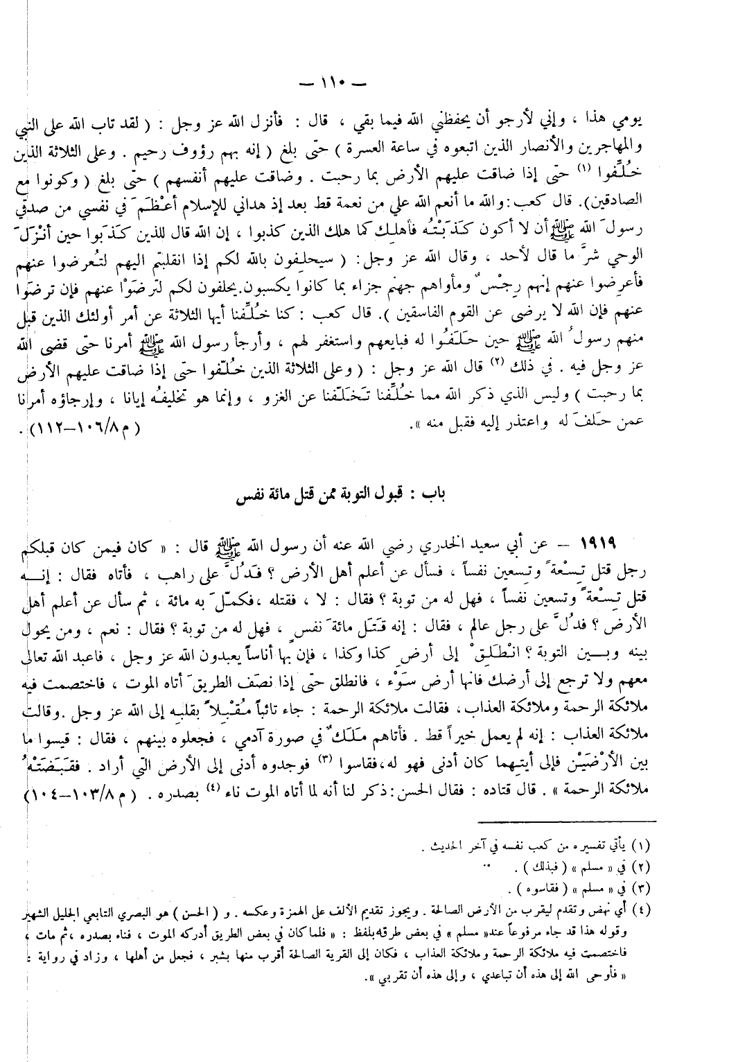 1919 - عَنْ أَبِي سَعِيدٍ الْخُدْرِيِّ - رضي الله عنه - أَنَّ رسول اللَّهِ - صَلَّى اللَّهُ عَلَيْهِ وَسَلَّمَ - قَالَ كَانَ فِيمَنْ كَانَ قَبْلَكُمْ رَجُلٌ قَتَلَ تِسْعَةً وَتِسْعِينَ نَفْسًا فَسَأَلَ عَنْ أَعْلَمِ أَهْلِ الْأَرْضِ فَدُلَّ عَلَى رَاهِبٍ فَأَتَاهُ فَقَالَ إِنَّهُ قَتَلَ تِسْعَةً وَتِسْعِينَ نَفْسًا فَهَلْ لَهُ مِنْ تَوْبَةٍ فَقَالَ لَا فَقَتَلَهُ فَكَمَّلَ بِهِ مِائَةً ثُمَّ سَأَلَ عَنْ أَعْلَمِ أَهْلِ الْأَرْضِ فَدُلَّ عَلَى رَجُلٍ عَالِمٍ فَقَالَ إِنَّهُ قَتَلَ مِائَةَ نَفْسٍ فَهَلْ لَهُ مِنْ تَوْبَةٍ فَقَالَ نَعَمْ وَمَنْ يَحُولُ بَيْنَهُ وَبَيْنَ التَّوْبَةِ انْطَلِقْ إِلَى أَرْضِ كَذَا وَكَذَا فَإِنَّ بِهَا أُنَاسًا يَعْبُدُونَ اللَّهَ عز وجل فَاعْبُدْ اللَّهَ تعالى مَعَهُمْ وَلَا تَرْجِعْ إِلَى أَرْضِكَ فَإِنَّهَا أَرْضُ سَوْءٍ فَانْطَلَقَ حَتَّى إِذَا نَصَفَ الطَّرِيقَ أَتَاهُ الْمَوْتُ فَاخْتَصَمَتْ فِيهِ مَلَائِكَةُ الرَّحْمَةِ وَمَلَائِكَةُ الْعَذَابِ فَقَالَتْ مَلَائِكَةُ الرَّحْمَةِ جَاءَ تَائِبًا مُقْبِلًا بِقَلْبِهِ إِلَى اللَّهِ عز وجل وَقَالَتْ مَلَائِكَةُ الْعَذَابِ إِنَّهُ لَمْ يَعْمَلْ خَيْرًا قَطُّ فَأَتَاهُمْ مَلَكٌ فِي صُورَةِ آدَمِيٍّ فَجَعَلُوهُ بَيْنَهُمْ فَقَالَ قِيسُوا مَا بَيْنَ الْأَرْضَيْنِ فَإِلَى أَيَّتِهِمَا كَانَ أَدْنَى فَهُوَ لَهُ فَقَاسُوا (¬3) فَوَجَدُوهُ أَدْنَى إِلَى الْأَرْضِ الَّتِي أَرَادَ فَقَبَضَتْهُ مَلَائِكَةُ الرَّحْمَةِ قَالَ قَتَادَةُ فَقَالَ الْحَسَنُ ذُكِرَ لَنَا أَنَّهُ لَمَّا أَتَاهُ الْمَوْتُ نَاء (¬4) بِصَدْرِهِ. (م 8/ 103 - 104)