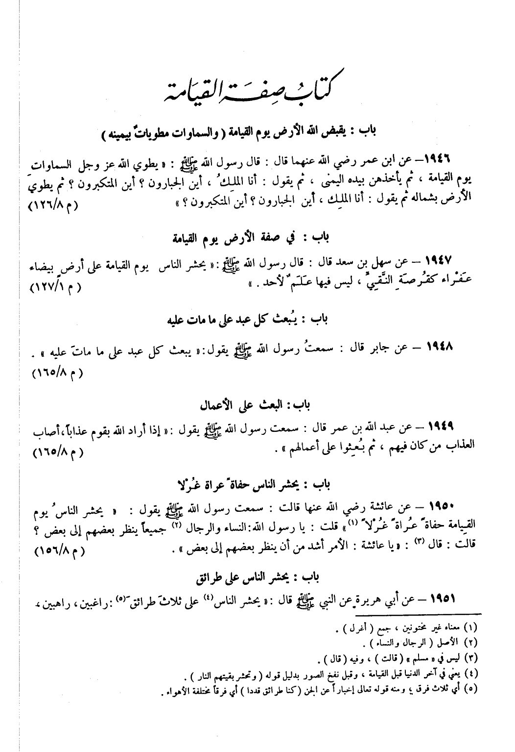 1947 - عَنْ سَهْلِ بْنِ سَعْدٍ قَالَ قَالَ رَسُولُ اللَّهِ - صَلَّى اللَّهُ عَلَيْهِ وَسَلَّمَ - يُحْشَرُ النَّاسُ يَوْمَ الْقِيَامَةِ عَلَى أَرْضٍ بَيْضَاءَ عَفْرَاءَ كَقُرْصَةِ النَّقِيِّ لَيْسَ فِيهَا عَلَمٌ لِأَحَدٍ. (م 1/ 127)