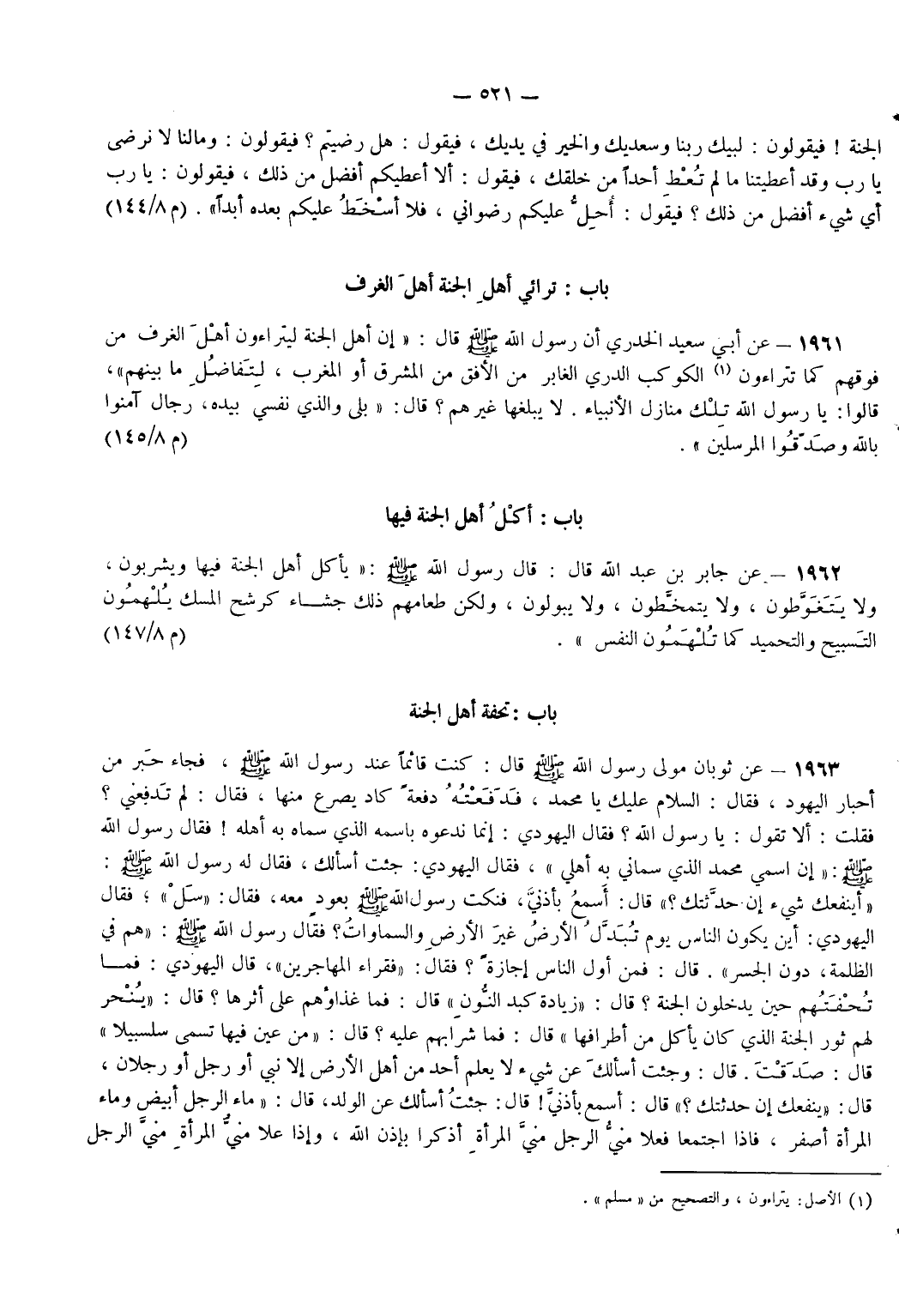 الْجَنَّةِ فَيَقُولُونَ لَبَّيْكَ رَبَّنَا وَسَعْدَيْكَ وَالْخَيْرُ فِي يَدَيْكَ فَيَقُولُ هَلْ رَضِيتُمْ فَيَقُولُونَ وَمَا لَنَا لَا نَرْضَى يَا رَبِّ وَقَدْ أَعْطَيْتَنَا مَا لَمْ تُعْطِ أَحَدًا مِنْ خَلْقِكَ فَيَقُولُ أَلَا أُعْطِيكُمْ أَفْضَلَ مِنْ ذَلِكَ فَيَقُولُونَ يَا رَبِّ وَأَيُّ شَيْءٍ أَفْضَلُ مِنْ ذَلِكَ فَيَقُولُ أُحِلُّ عَلَيْكُمْ رِضْوَانِي فَلَا أَسْخَطُ عَلَيْكُمْ بَعْدَهُ أَبَدًا. (م 8/ 144)