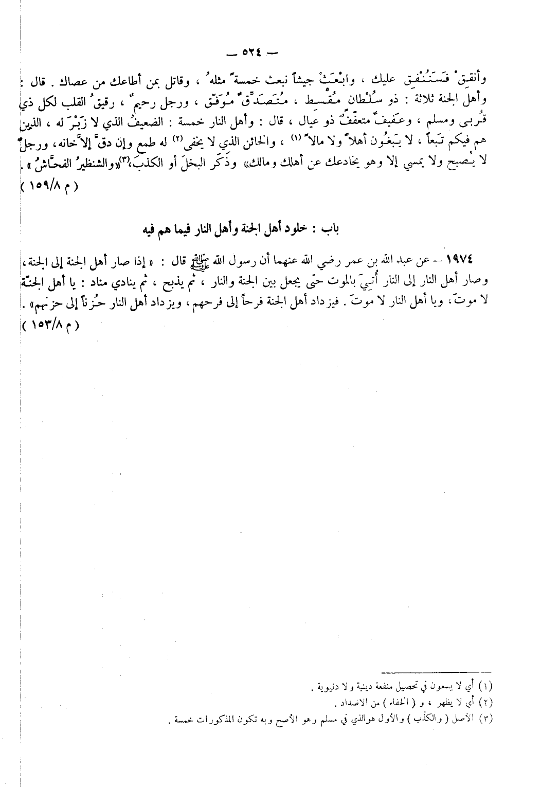 1974 - عَنْ عَبْدِ اللَّهِ بْنِ عُمَرَ - رضي الله عنهما - أَنَّ رَسُولَ اللَّهِ - صَلَّى اللَّهُ عَلَيْهِ وَسَلَّمَ - قَالَ إِذَا صَارَ أَهْلُ الْجَنَّةِ إِلَى الْجَنَّةِ وَصَارَ أَهْلُ النَّارِ إِلَى النَّارِ أُتِيَ بِالْمَوْتِ حَتَّى يُجْعَلَ بَيْنَ الْجَنَّةِ وَالنَّارِ ثُمَّ يُذْبَحُ ثُمَّ يُنَادِي مُنَادٍ يَا أَهْلَ الْجَنَّةِ لَا مَوْتَ وَيَا أَهْلَ النَّارِ لَا مَوْتَ فَيَزْدَادُ أَهْلُ الْجَنَّةِ فَرَحًا إِلَى فَرَحِهِمْ وَيَزْدَادُ أَهْلُ النَّارِ حُزْنًا إِلَى حُزْنِهِمْ. (م 8/ 153)