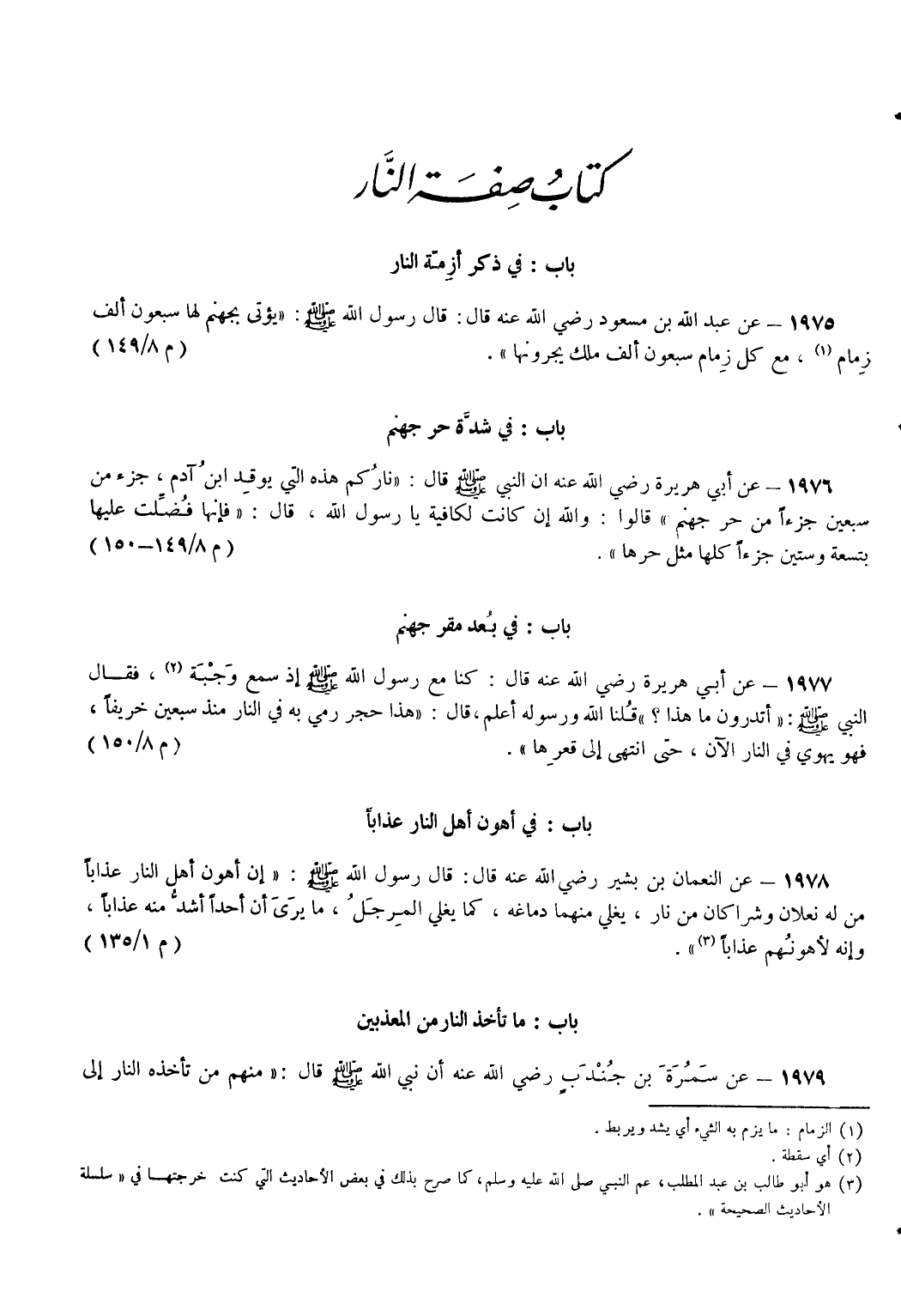 1976 - عَنْ أَبِي هُرَيْرَةَ - رضي الله عنه - أَنَّ النَّبِيَّ - صَلَّى اللَّهُ عَلَيْهِ وَسَلَّمَ - قَالَ نَارُكُمْ هَذِهِ الَّتِي يُوقِدُ ابْنُ آدَمَ جُزْءٌ مِنْ سَبْعِينَ جُزْءًا مِنْ حَرِّ جَهَنَّمَ قَالُوا وَاللَّهِ إِنْ كَانَتْ لَكَافِيَةً يَا رَسُولَ اللَّهِ قَالَ فَإِنَّهَا فُضِّلَتْ عَلَيْهَا بِتِسْعَةٍ وَسِتِّينَ جُزْءًا كُلُّهَا مِثْلُ حَرِّهَا. (م 8/ 149 - 150)