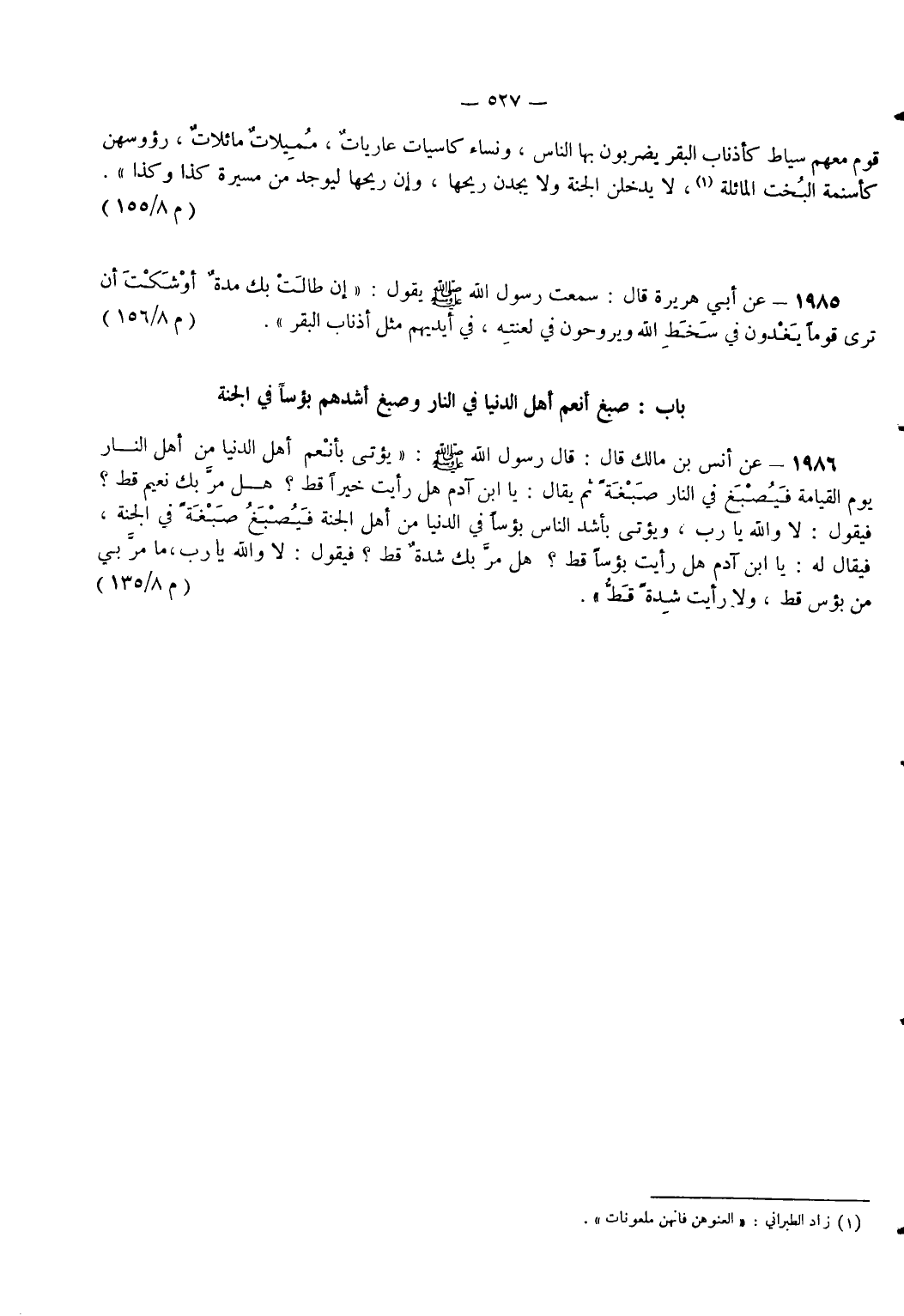 1986 - عَنْ أَنَسِ بْنِ مَالِكٍ قَالَ قَالَ رَسُولُ اللَّهِ - صَلَّى اللَّهُ عَلَيْهِ وَسَلَّمَ - يُؤْتَى بِأَنْعَمِ أَهْلِ الدُّنْيَا مِنْ أَهْلِ النَّارِ يَوْمَ الْقِيَامَةِ فَيُصْبَغُ فِي النَّارِ صَبْغَةً ثُمَّ يُقَالُ يَا ابْنَ آدَمَ هَلْ رَأَيْتَ خَيْرًا قَطُّ هَلْ مَرَّ بِكَ نَعِيمٌ قَطُّ فَيَقُولُ لَا وَاللَّهِ يَا رَبِّ وَيُؤْتَى بِأَشَدِّ النَّاسِ بُؤْسًا فِي الدُّنْيَا مِنْ أَهْلِ الْجَنَّةِ فَيُصْبَغُ صَبْغَةً فِي الْجَنَّةِ فَيُقَالُ لَهُ يَا ابْنَ آدَمَ هَلْ رَأَيْتَ بُؤْسًا قَطُّ هَلْ مَرَّ بِكَ شِدَّةٌ قَطُّ فَيَقُولُ لَا وَاللَّهِ يَا رَبِّ مَا مَرَّ بِي بُؤْسٌ قَطُّ وَلَا رَأَيْتُ شِدَّةً قَطُّ. (م 8/ 135)