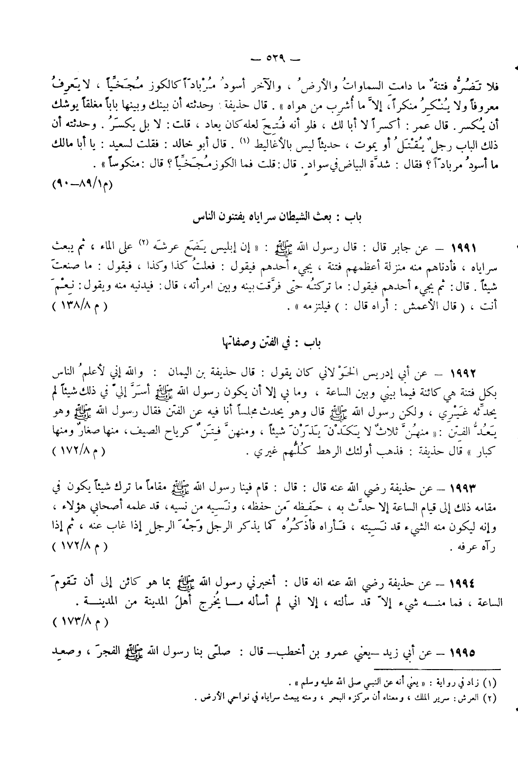 1992 - عن أَبي إِدْرِيسَ الْخَوْلَانِيَّ كَانَ يَقُولُ قَالَ حُذَيْفَةُ بْنُ الْيَمَانِ وَاللَّهِ إِنِّي لَأَعْلَمُ النَّاسِ بِكُلِّ فِتْنَةٍ هِيَ كَائِنَةٌ فِيمَا بَيْنِي وَبَيْنَ السَّاعَةِ وَمَا بِي إِلَّا أَنْ يَكُونَ رَسُولُ اللَّهِ - صَلَّى اللَّهُ عَلَيْهِ وَسَلَّمَ - أَسَرَّ إِلَيَّ فِي ذَلِكَ شَيْئًا لَمْ يُحَدِّثْهُ غَيْرِي وَلَكِنْ رَسُولُ اللَّهِ - صَلَّى اللَّهُ عَلَيْهِ وَسَلَّمَ - قَالَ وَهُوَ يُحَدِّثُ مَجْلِسًا أَنَا فِيهِ عَنْ الْفِتَنِ فَقَالَ رَسُولُ اللَّهِ - صَلَّى اللَّهُ عَلَيْهِ وَسَلَّمَ - وَهُوَ يَعُدُّ الْفِتَنَ مِنْهُنَّ ثَلَاثٌ لَا يَكَدْنَ يَذَرْنَ شَيْئًا وَمِنْهُنَّ فِتَنٌ كَرِيَاحِ الصَّيْفِ مِنْهَا صِغَارٌ وَمِنْهَا كِبَارٌ قَالَ حُذَيْفَةُ فَذَهَبَ أُولَئِكَ الرَّهْطُ كُلُّهُمْ غَيْرِي. (م 8/ 172)