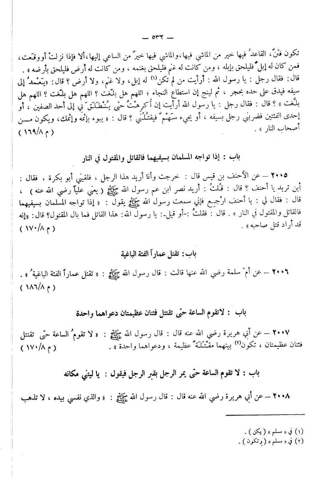 2005 - عَنْ الْأَحْنَفِ بْنِ قَيْسٍ قَالَ خَرَجْتُ وَأَنَا أُرِيدُ هَذَا الرَّجُلَ فَلَقِيَنِي أَبُو بَكْرَةَ فَقَالَ أَيْنَ تُرِيدُ يَا أَحْنَفُ قَالَ قُلْتُ أُرِيدُ نَصْرَ ابْنِ عَمِّ رَسُولِ اللَّهِ - صَلَّى اللَّهُ عَلَيْهِ وَسَلَّمَ - يَعْنِي عَلِيًّا - رضي الله عنه - قَالَ فَقَالَ لِي يَا أَحْنَفُ ارْجِعْ فَإِنِّي سَمِعْتُ رَسُولَ اللَّهِ - صَلَّى اللَّهُ عَلَيْهِ وَسَلَّمَ - يَقُولُ إِذَا تَوَاجَهَ الْمُسْلِمَانِ بِسَيْفَيْهِمَا فَالْقَاتِلُ وَالْمَقْتُولُ فِي النَّارِ قَالَ فَقُلْتُ أَوْ قِيلَ يَا رَسُولَ اللَّهِ هَذَا الْقَاتِلُ فَمَا بَالُ الْمَقْتُولِ قَالَ إِنَّهُ قَدْ أَرَادَ قَتْلَ صَاحِبِهِ. (م 8/ 170)