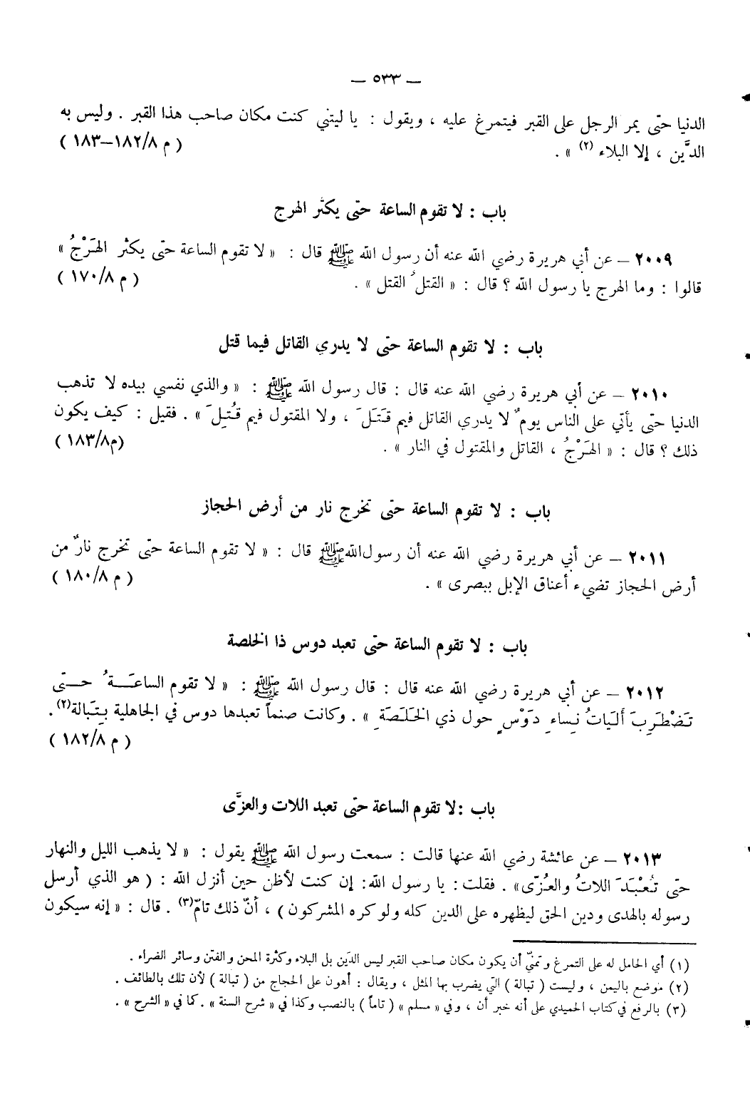 2010 - عَنْ أَبِي هُرَيْرَةَ - رضي الله عنه - قَالَ قَالَ رَسُولُ اللَّهِ - صَلَّى اللَّهُ عَلَيْهِ وَسَلَّمَ - وَالَّذِي نَفْسِي بِيَدِهِ لَا تَذْهَبُ الدُّنْيَا حَتَّى يَأْتِيَ عَلَى النَّاسِ يَوْمٌ لَا يَدْرِي الْقَاتِلُ فِيمَ قَتَلَ وَلَا الْمَقْتُولُ فِيمَ قُتِلَ فَقِيلَ كَيْفَ يَكُونُ ذَلِكَ قَالَ الْهَرْجُ الْقَاتِلُ وَالْمَقْتُولُ فِي النَّارِ. (م 8/ 183)