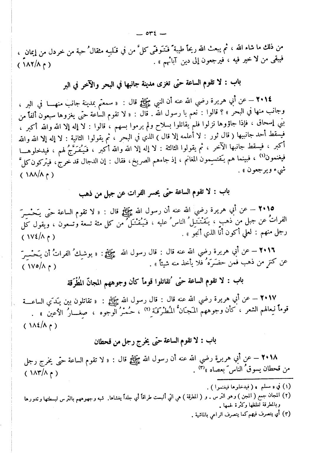 2018 - عَنْ أَبِي هُرَيْرَةَ - رضي الله عنه - أَنَّ رَسُولَ اللَّهِ - صَلَّى اللَّهُ عَلَيْهِ وَسَلَّمَ - قَالَ لَا تَقُومُ السَّاعَةُ حَتَّى يَخْرُجَ رَجُلٌ مِنْ قَحْطَانَ يَسُوقُ النَّاسَ بِعَصَاهُ (¬3). (م 8/ 183)