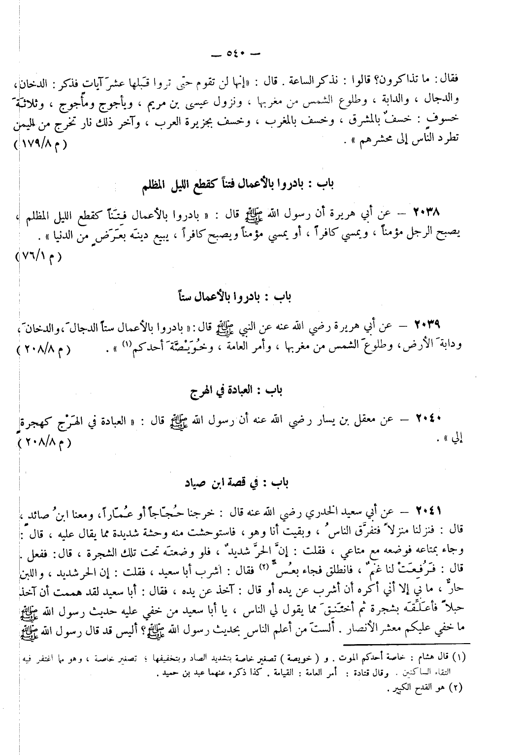 2038 - عَنْ أَبِي هُرَيْرَةَ أَنَّ رَسُولَ اللَّهِ - صَلَّى اللَّهُ عَلَيْهِ وَسَلَّمَ - قَالَ بَادِرُوا بِالْأَعْمَالِ فِتَنًا كَقِطَعِ اللَّيْلِ الْمُظْلِمِ يُصْبِحُ الرَّجُلُ مُؤْمِنًا وَيُمْسِي كَافِرًا أَوْ يُمْسِي مُؤْمِنًا وَيُصْبِحُ كَافِرًا يَبِيعُ دِينَهُ بِعَرَضٍ مِنْ الدُّنْيَا. (م 1/ 76)