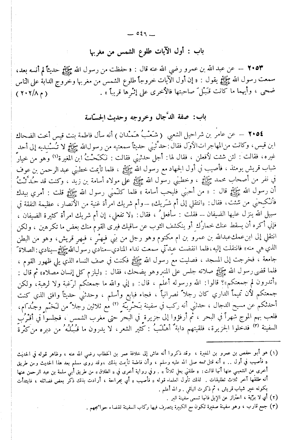 2054 - عن عَامِر بْن شَرَاحِيلَ الشَّعْبِيُّ شَعْبُ هَمْدَانَ أَنَّهُ سَأَلَ فَاطِمَةَ بِنْتَ قَيْسٍ أُخْتَ الضَّحَّاكِ بْنِ قَيْسٍ وَكَانَتْ مِنْ الْمُهَاجِرَاتِ الْأُوَلِ فَقَالَ حَدِّثِينِي حَدِيثًا سَمِعْتِيهِ مِنْ رَسُولِ اللَّهِ - صَلَّى اللَّهُ عَلَيْهِ وَسَلَّمَ - لَا تُسْنِدِيهِ إِلَى أَحَدٍ غَيْرِهِ فَقَالَتْ لَئِنْ شِئْتَ لَأَفْعَلَنَّ فَقَالَ لَهَا أَجَلْ حَدِّثِينِي فَقَالَتْ نَكَحْتُ ابْنَ الْمُغِيرَةِ (¬1) وَهُوَ مِنْ خِيَارِ شَبَابِ قُرَيْشٍ يَوْمَئِذٍ فَأُصِيبَ فِي أَوَّلِ الْجِهَادِ مَعَ رَسُولِ اللَّهِ - صَلَّى اللَّهُ عَلَيْهِ وَسَلَّمَ - فَلَمَّا تَأَيَّمْتُ خَطَبَنِي عَبْدُ الرَّحْمَنِ بْنُ عَوْفٍ فِي نَفَرٍ مِنْ أَصْحَابِ رَسُولِ اللَّهِ - صَلَّى اللَّهُ عَلَيْهِ وَسَلَّمَ - وَخَطَبَنِي رَسُولُ اللَّهِ - صَلَّى اللَّهُ عَلَيْهِ وَسَلَّمَ - عَلَى مَوْلَاهُ أُسَامَةَ بْنِ زَيْدٍ وَكُنْتُ قَدْ حُدِّثْتُ أَنَّ رَسُولَ اللَّهِ - صَلَّى اللَّهُ عَلَيْهِ وَسَلَّمَ - قَالَ مَنْ أَحَبَّنِي فَلْيُحِبَّ أُسَامَةَ فَلَمَّا كَلَّمَنِي رَسُولُ اللَّهِ - صَلَّى اللَّهُ عَلَيْهِ وَسَلَّمَ - قُلْتُ أَمْرِي بِيَدِكَ فَأَنْكِحْنِي مَنْ شِئْتَ فَقَالَ انْتَقِلِي إِلَى أُمِّ شَرِيكٍ وَأُمُّ شَرِيكٍ امْرَأَةٌ غَنِيَّةٌ مِنْ الْأَنْصَارِ عَظِيمَةُ النَّفَقَةِ فِي سَبِيلِ اللَّهِ يَنْزِلُ عَلَيْهَا الضِّيفَانُ فَقُلْتُ سَأَفْعَلُ فَقَالَ لَا تَفْعَلِي إِنَّ أُمَّ شَرِيكٍ امْرَأَةٌ كَثِيرَةُ الضِّيفَانِ فَإِنِّي أَكْرَهُ أَنْ يَسْقُطَ عَنْكِ خِمَارُكِ أَوْ يَنْكَشِفَ الثَّوْبُ عَنْ سَاقَيْكِ فَيَرَى الْقَوْمُ مِنْكِ بَعْضَ مَا تَكْرَهِينَ وَلَكِنْ انْتَقِلِي إِلَى ابْنِ عَمِّكِ عَبْدِ اللَّهِ بْنِ عَمْرِو ابْنِ أُمِّ مَكْتُومٍ وَهُوَ رَجُلٌ مِنْ بَنِي فِهْرٍ فِهْرِ قُرَيْشٍ وَهُوَ مِنْ الْبَطْنِ الَّذِي هِيَ مِنْهُ فَانْتَقَلْتُ إِلَيْهِ فَلَمَّا انْقَضَتْ عِدَّتِي سَمِعْتُ نِدَاءَ الْمُنَادِي مُنَادِي رَسُولِ اللَّهِ - صَلَّى اللَّهُ عَلَيْهِ وَسَلَّمَ - يُنَادِي الصَّلَاةَ جَامِعَةً فَخَرَجْتُ إِلَى الْمَسْجِدِ فَصَلَّيْتُ مَعَ رَسُولِ اللَّهِ - صَلَّى اللَّهُ عَلَيْهِ وَسَلَّمَ - فَكُنْتُ فِي صَفِّ النِّسَاءِ الذي يلِي ظُهُورَ الْقَوْمِ فَلَمَّا قَضَى رَسُولُ اللَّهِ - صَلَّى اللَّهُ عَلَيْهِ وَسَلَّمَ - صَلَاتَهُ جَلَسَ عَلَى الْمِنْبَرِ وَهُوَ يَضْحَكُ فَقَالَ لِيَلْزَمْ كُلُّ إِنْسَانٍ مُصَلَّاهُ ثُمَّ قَالَ أَتَدْرُونَ لِمَ جَمَعْتُكُمْ قَالُوا اللَّهُ وَرَسُولُهُ أَعْلَمُ قَالَ إِنِّي وَاللَّهِ مَا جَمَعْتُكُمْ لِرَغْبَةٍ وَلَا لِرَهْبَةٍ وَلَكِنْ جَمَعْتُكُمْ لِأَنَّ تَمِيمًا الدَّارِيَّ كَانَ رَجُلًا نَصْرَانِيًّا فَجَاءَ فَبَايَعَ وَأَسْلَمَ وَحَدَّثَنِي حَدِيثًا وَافَقَ الَّذِي كُنْتُ أُحَدِّثُكُمْ عَنْ مَسِيحِ الدَّجَّالِ حَدَّثَنِي أَنَّهُ رَكِبَ فِي سَفِينَةٍ بَحْرِيَّةٍ (¬2) مَعَ ثَلَاثِينَ رَجُلًا مِنْ لَخْمٍ وَجُدامَ فَلَعِبَ بِهِمْ الْمَوْجُ شَهْرًا فِي الْبَحْرِ ثُمَّ أَرْفَؤوا إِلَى جَزِيرَةٍ فِي الْبَحْرِ حَتَّى مَغْرِبِ الشَّمْسِ فَجَلَسُوا فِي أَقْرُبْ السَّفِينَةِ (¬3) فَدَخَلُوا الْجَزِيرَةَ فَلَقِيَتْهُمْ دَابَّةٌ أَهْلَبُ كَثِيرُ الشَّعَرِ لَا يَدْرُونَ مَا قُبُلُهُ مِنْ دُبُرِهِ مِنْ كَثْرَةِ