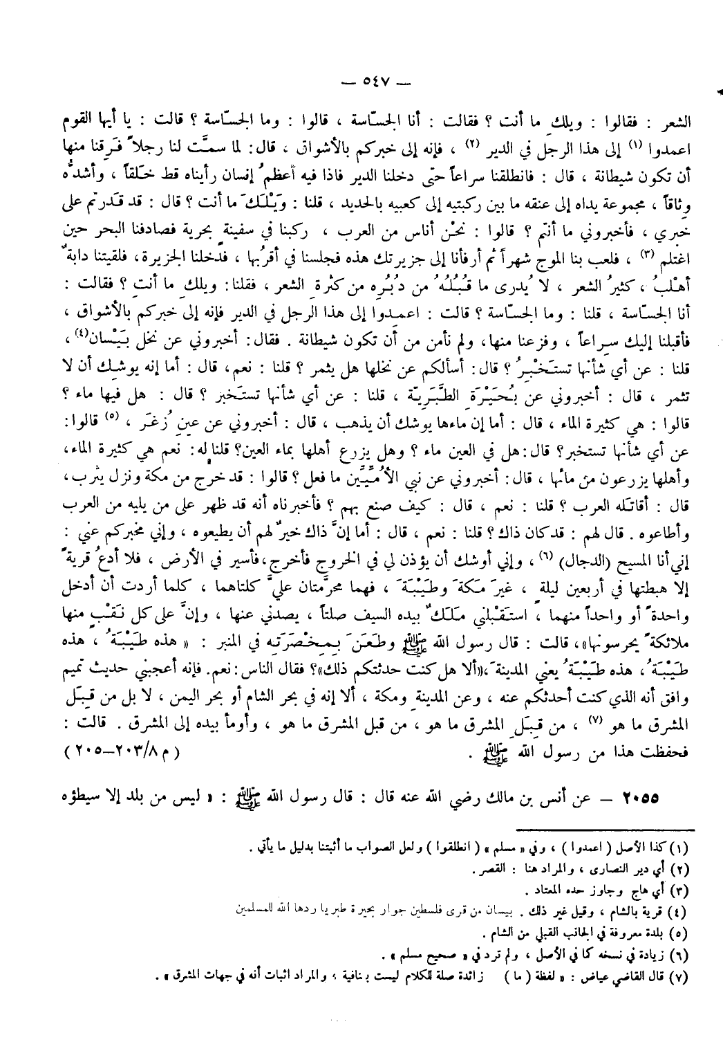 الشَّعَرِ فَقَالُوا وَيْلَكِ مَا أَنْتِ فَقَالَتْ أَنَا الْجَسَّاسَةُ قَالُوا وَمَا الْجَسَّاسَةُ قَالَتْ أَيُّهَا الْقَوْمُ اعمدوا (¬1) إِلَى هَذَا الرَّجُلِ فِي الدَّيْرِ (¬2) فَإِنَّهُ إِلَى خَبَرِكُمْ بِالْأَشْوَاقِ قَالَ لَمَّا سَمَّتْ لَنَا رَجُلًا فَرِقْنَا مِنْهَا أَنْ تَكُونَ شَيْطَانَةً قَالَ فَانْطَلَقْنَا سِرَاعًا حَتَّى دَخَلْنَا الدَّيْرَ فَإِذَا فِيهِ أَعْظَمُ إِنْسَانٍ رَأَيْنَاهُ قَطُّ خَلْقًا وَأَشَدُّهُ وِثَاقًا مَجْمُوعَةٌ يَدَاهُ إِلَى عُنُقِهِ مَا بَيْنَ رُكْبَتَيْهِ إِلَى كَعْبَيْهِ بِالْحَدِيدِ قُلْنَا وَيْلَكَ مَا أَنْتَ قَالَ قَدْ قَدَرْتُمْ عَلَى خَبَرِي فَأَخْبِرُونِي مَا أَنْتُمْ قَالُوا نَحْنُ أُنَاسٌ مِنْ الْعَرَبِ رَكِبْنَا فِي سَفِينَةٍ بَحْرِيَّةٍ فَصَادَفْنَا الْبَحْرَ حِينَ اغْتَلَمَ (¬3) فَلَعِبَ بِنَا الْمَوْجُ شَهْرًا ثُمَّ أَرْفَأْنَا إِلَى جَزِيرَتِكَ هَذِهِ فَجَلَسْنَا فِي أَقْرُبِهَا فَدَخَلْنَا الْجَزِيرَةَ فَلَقِيَتْنَا دَابَّةٌ أَهْلَبُ كَثِيرُ الشَّعَرِ لَا يُدْرَى مَا قُبُلُهُ مِنْ دُبُرِهِ مِنْ كَثْرَةِ الشَّعَرِ فَقُلْنَا وَيْلَكِ مَا أَنْتِ فَقَالَتْ أَنَا الْجَسَّاسَةُ قُلْنَا وَمَا الْجَسَّاسَةُ قَالَتْ اعْمِدُوا إِلَى هَذَا الرَّجُلِ فِي الدَّيْرِ فَإِنَّهُ إِلَى خَبَرِكُمْ بِالْأَشْوَاقِ فَأَقْبَلْنَا إِلَيْكَ سِرَاعًا وَفَزِعْنَا مِنْهَا وَلَمْ نَأْمَنْ أَنْ تَكُونَ شَيْطَانَةً فَقَالَ أَخْبِرُونِي عَنْ نَخْلِ بَيْسَانَ (¬4) قُلْنَا عَنْ أَيِّ شَأْنِهَا تَسْتَخْبِرُ قَالَ أَسْأَلُكُمْ عَنْ نَخْلِهَا هَلْ يُثْمِرُ قُلْنَا نَعَمْ قَالَ أَمَا إِنَّهُ يُوشِكُ أَنْ لَا تُثْمِرَ قَالَ أَخْبِرُونِي عَنْ بُحَيْرَةِ الطَّبَرِيَّةِ قُلْنَا عَنْ أَيِّ شَأْنِهَا تَسْتَخْبِرُ قَالَ هَلْ فِيهَا مَاءٌ قَالُوا هِيَ كَثِيرَةُ الْمَاءِ قَالَ أَمَا إِنَّ مَاءَهَا يُوشِكُ أَنْ يَذْهَبَ قَالَ أَخْبِرُونِي عَنْ عَيْنِ زُغَرَ (¬5) قَالُوا عَنْ أَيِّ شَأْنِهَا تَسْتَخْبِرُ قَالَ هَلْ فِي الْعَيْنِ مَاءٌ وَهَلْ يَزْرَعُ أَهْلُهَا بِمَاءِ الْعَيْنِ قُلْنَا لَهُ نَعَمْ هِيَ كَثِيرَةُ الْمَاءِ وَأَهْلُهَا يَزْرَعُونَ مِنْ مَائِهَا قَالَ أَخْبِرُونِي عَنْ نَبِيِّ الْأُمِّيِّينَ مَا فَعَلَ قَالُوا قَدْ خَرَجَ مِنْ مَكَّةَ وَنَزَلَ يَثْرِبَ قَالَ أَقَاتَلَهُ الْعَرَبُ قُلْنَا نَعَمْ قَالَ كَيْفَ صَنَعَ بِهِمْ فَأَخْبَرْنَاهُ أَنَّهُ قَدْ ظَهَرَ عَلَى مَنْ يَلِيهِ مِنْ الْعَرَبِ وَأَطَاعُوهُ قَالَ لَهُمْ قَدْ كَانَ ذَلِكَ قُلْنَا نَعَمْ قَالَ أَمَا إِنَّ ذَاكَ خَيْرٌ لَهُمْ أَنْ يُطِيعُوهُ وَإِنِّي مُخْبِرُكُمْ عَنِّي إِنِّي أَنَا الْمَسِيحُ الدجال (¬6) وَإِنِّي أُوشِكُ أَنْ يُؤْذَنَ لِي فِي الْخُرُوجِ فَأَخْرُجَ فَأَسِيرَ فِي الْأَرْضِ فَلَا أَدَعَ قَرْيَةً إِلَّا هَبَطْتُهَا فِي أَرْبَعِينَ لَيْلَةً غَيْرَ مَكَّةَ وَطَيْبَةَ فَهُمَا مُحَرَّمَتَانِ عَلَيَّ كِلْتَاهُمَا كُلَّمَا أَرَدْتُ أَنْ أَدْخُلَ وَاحِدَةً أَوْ وَاحِدًا مِنْهُمَا اسْتَقْبَلَنِي مَلَكٌ بِيَدِهِ السَّيْفُ صَلْتًا يَصُدُّنِي عَنْهَا وَإِنَّ عَلَى كُلِّ نَقْبٍ مِنْهَا مَلَائِكَةً يَحْرُسُونَهَا قَالَتْ قَالَ رَسُولُ اللَّهِ - صَلَّى اللَّهُ عَلَيْهِ وَسَلَّمَ - وَطَعَنَ بِمِخْصَرَتِهِ فِي الْمِنْبَرِ هَذِهِ طَيْبَةُ هَذِهِ طَيْبَةُ هَذِهِ طَيْبَةُ يَعْنِي الْمَدِينَةَ أَلَا هَلْ كُنْتُ حَدَّثْتُكُمْ ذَلِكَ فَقَالَ النَّاسُ نَعَمْ فَإِنَّهُ أَعْجَبَنِي حَدِيثُ تَمِيمٍ أَنَّهُ وَافَقَ الَّذِي كُنْتُ أُحَدِّثُكُمْ عَنْهُ وَعَنْ الْمَدِينَةِ وَمَكَّةَ أَلَا إِنَّهُ فِي بَحْرِ الشَّأْمِ أَوْ بَحْرِ الْيَمَنِ لَا بَلْ مِنْ قِبَلِ الْمَشْرِقِ مَا هُوَ (¬7) مِنْ قِب
