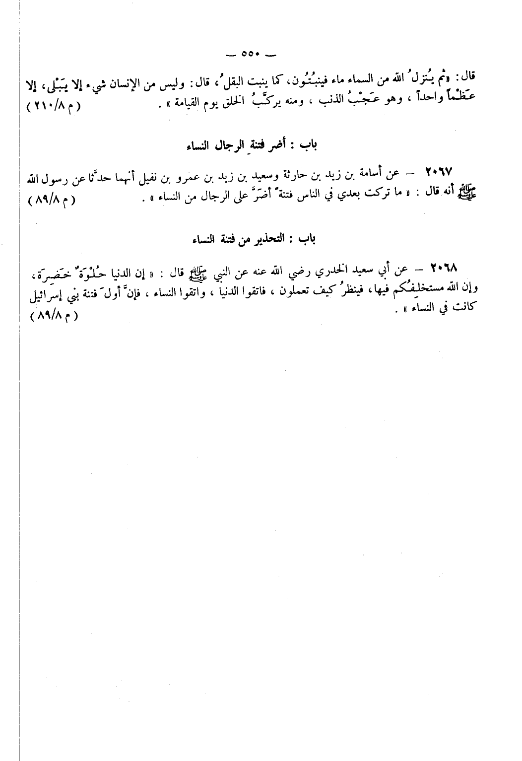 2067 - عَنْ أُسَامَةَ بْنِ زَيْدِ بْنِ حَارِثَةَ وَسَعِيدِ بْنِ زَيْدِ بْنِ عَمْرِو بْنِ نُفَيْلٍ أَنَّهُمَا حَدَّثَا عَنْ رَسُولِ اللَّهِ - صَلَّى اللَّهُ عَلَيْهِ وَسَلَّمَ - أَنَّهُ قَالَ مَا تَرَكْتُ بَعْدِي فِي النَّاسِ فِتْنَةً أَضَرَّ عَلَى الرِّجَالِ مِنْ النِّسَاءِ. (م 8/ 89)