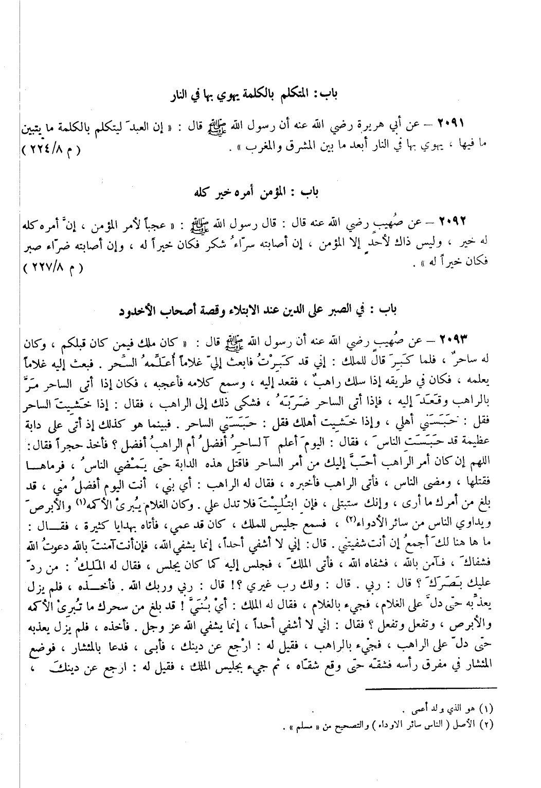 2093 - عَنْ صُهَيْبٍ - رضي الله عنه - أَنَّ رَسُولَ اللَّهِ - صَلَّى اللَّهُ عَلَيْهِ وَسَلَّمَ - قَالَ كَانَ مَلِكٌ فِيمَنْ كَانَ قَبْلَكُمْ وَكَانَ لَهُ سَاحِرٌ فَلَمَّا كَبِرَ قَالَ لِلْمَلِكِ إِنِّي قَدْ كَبِرْتُ فَابْعَثْ إِلَيَّ غُلَامًا أُعَلِّمْهُ السِّحْرَ فَبَعَثَ إِلَيْهِ غُلَامًا يُعَلِّمُهُ فَكَانَ فِي طَرِيقِهِ إِذَا سَلَكَ رَاهِبٌ فَقَعَدَ إِلَيْهِ وَسَمِعَ كَلَامَهُ فَأَعْجَبَهُ فَكَانَ إِذَا أَتَى السَّاحِرَ مَرَّ بِالرَّاهِبِ وَقَعَدَ إِلَيْهِ فَإِذَا أَتَى السَّاحِرَ ضَرَبَهُ فَشَكَا ذَلِكَ إِلَى الرَّاهِبِ فَقَالَ إِذَا خَشِيتَ السَّاحِرَ فَقُلْ حَبَسَنِي أَهْلِي وَإِذَا خَشِيتَ أَهْلَكَ فَقُلْ حَبَسَنِي السَّاحِرُ فَبَيْنَمَا هُوَ كَذَلِكَ إِذْ أَتَى عَلَى دَابَّةٍ عَظِيمَةٍ قَدْ حَبَسَتْ النَّاسَ فَقَالَ الْيَوْمَ أَعْلَمُ آلسَّاحِرُ أَفْضَلُ أَمْ الرَّاهِبُ أَفْضَلُ فَأَخَذَ حَجَرًا فَقَالَ اللَّهُمَّ إِنْ كَانَ أَمْرُ الرَّاهِبِ أَحَبَّ إِلَيْكَ مِنْ أَمْرِ السَّاحِرِ فَاقْتُلْ هَذِهِ الدَّابَّةَ حَتَّى يَمْضِيَ النَّاسُ فَرَمَاهَا فَقَتَلَهَا وَمَضَى النَّاسُ فَأَتَى الرَّاهِبَ فَأَخْبَرَهُ فَقَالَ لَهُ الرَّاهِبُ أَيْ بُنَيَّ أَنْتَ الْيَوْمَ أَفْضَلُ مِنِّي قَدْ بَلَغَ مِنْ أَمْرِكَ مَا أَرَى وَإِنَّكَ سَتُبْتَلَى فَإِنْ ابْتُلِيتَ فَلَا تَدُلَّ عَلَيَّ وَكَانَ الْغُلَامُ يُبْرِئُ الْأَكْمَهَ (¬1) وَالْأَبْرَصَ وَيُدَاوِي النَّاسَ مِنْ سَائِرِ الْأَدْوَاءِ (¬2) فَسَمِعَ جَلِيسٌ لِلْمَلِكِ كَانَ قَدْ عَمِيَ فَأَتَاهُ بِهَدَايَا كَثِيرَةٍ فَقَالَ مَا هَاهُنَا لَكَ أَجْمَعُ إِنْ أَنْتَ شَفَيْتَنِي فَقَالَ إِنِّي لَا أَشْفِي أَحَدًا إِنَّمَا يَشْفِي اللَّهُ فَإِنْ أَنْتَ آمَنْتَ بِاللَّهِ دَعَوْتُ اللَّهَ فَشَفَاكَ فَآمَنَ بِاللَّهِ فَشَفَاهُ اللَّهُ فَأَتَى الْمَلِكَ فَجَلَسَ إِلَيْهِ كَمَا كَانَ يَجْلِسُ فَقَالَ لَهُ الْمَلِكُ مَنْ رَدَّ عَلَيْكَ بَصَرَكَ قَالَ رَبِّي قَالَ وَلَكَ رَبٌّ غَيْرِي قَالَ رَبِّي وَرَبُّكَ اللَّهُ فَأَخَذَهُ فَلَمْ يَزَلْ يُعَذِّبُهُ حَتَّى دَلَّ عَلَى الْغُلَامِ فَجِيءَ بِالْغُلَامِ فَقَالَ لَهُ الْمَلِكُ أَيْ بُنَيَّ قَدْ بَلَغَ مِنْ سِحْرِكَ مَا تُبْرِئُ الْأَكْمَهَ وَالْأَبْرَصَ وَتَفْعَلُ وَتَفْعَلُ فَقَالَ إِنِّي لَا أَشْفِي أَحَدًا إِنَّمَا يَشْفِي اللَّهُ عز وجل فَأَخَذَهُ فَلَمْ يَزَلْ يُعَذِّبُهُ حَتَّى دَلَّ عَلَى الرَّاهِبِ فَجِيءَ بِالرَّاهِبِ فَقِيلَ لَهُ ارْجِعْ عَنْ دِينِكَ, فأبى فدعا بالمئشار فوضع المئشار في مفرق رأسه فشقّه حتى وقع شقّاه ثم جيء بجليس الملك فقيل له ارجع عن دينك,