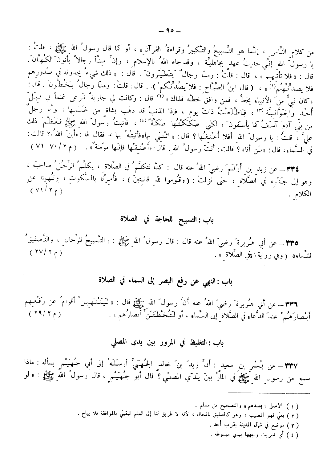 334 - عَنْ زَيْدِ بْنِ أَرْقَمَ - رضي الله عنه - قَالَ كُنَّا نَتَكَلَّمُ في الصَّلَاةِ يُكَلِّمُ الرَّجُلُ صَاحِبَهُ وَهُوَ إِلَى جَنْبِهِ في الصَّلَاةِ حَتَّى نَزَلَتْ وَقُومُوا لِلَّهِ قَانِتِينَ فَأُمِرْنَا بِالسُّكُوتِ وَنُهِينَا عَنْ الْكَلَامِ. (م 2/ 71)