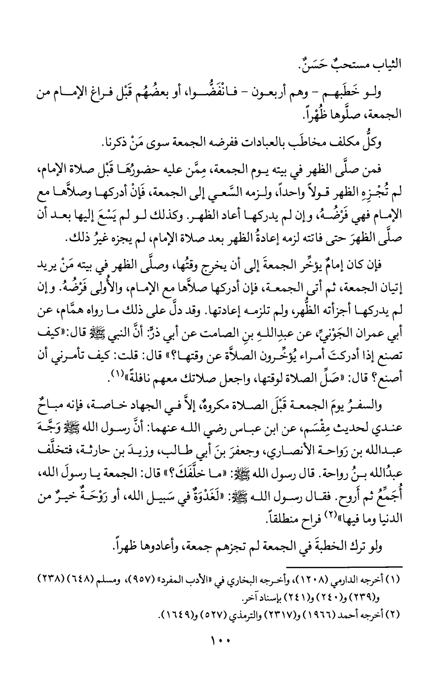 والسفر يوم الجمعة قبل الصلاة مكروه إلا في الجهاد خاصة فإنه مباح عندي لحديث مقسم عن أبي عباس رضي الله عنهما أن رسول الله صلى الله عليه وسلم وجهة عبدالله بن رواحة الإنصاري وجعفر بن أبي طالب وزيد بن حارثة فتخلف عبدالله بن رواحة قال رسول الله صلى الله عليه وسلم ماخلفك؟ قال الجمعة يارسول الله أجمع ثم أروح فقال رسول الله صلى الله عليه وسلم ((لغدوة في سبيل الله أو روحة خير من الدنيا وما فيها)) فراح منطلقا.