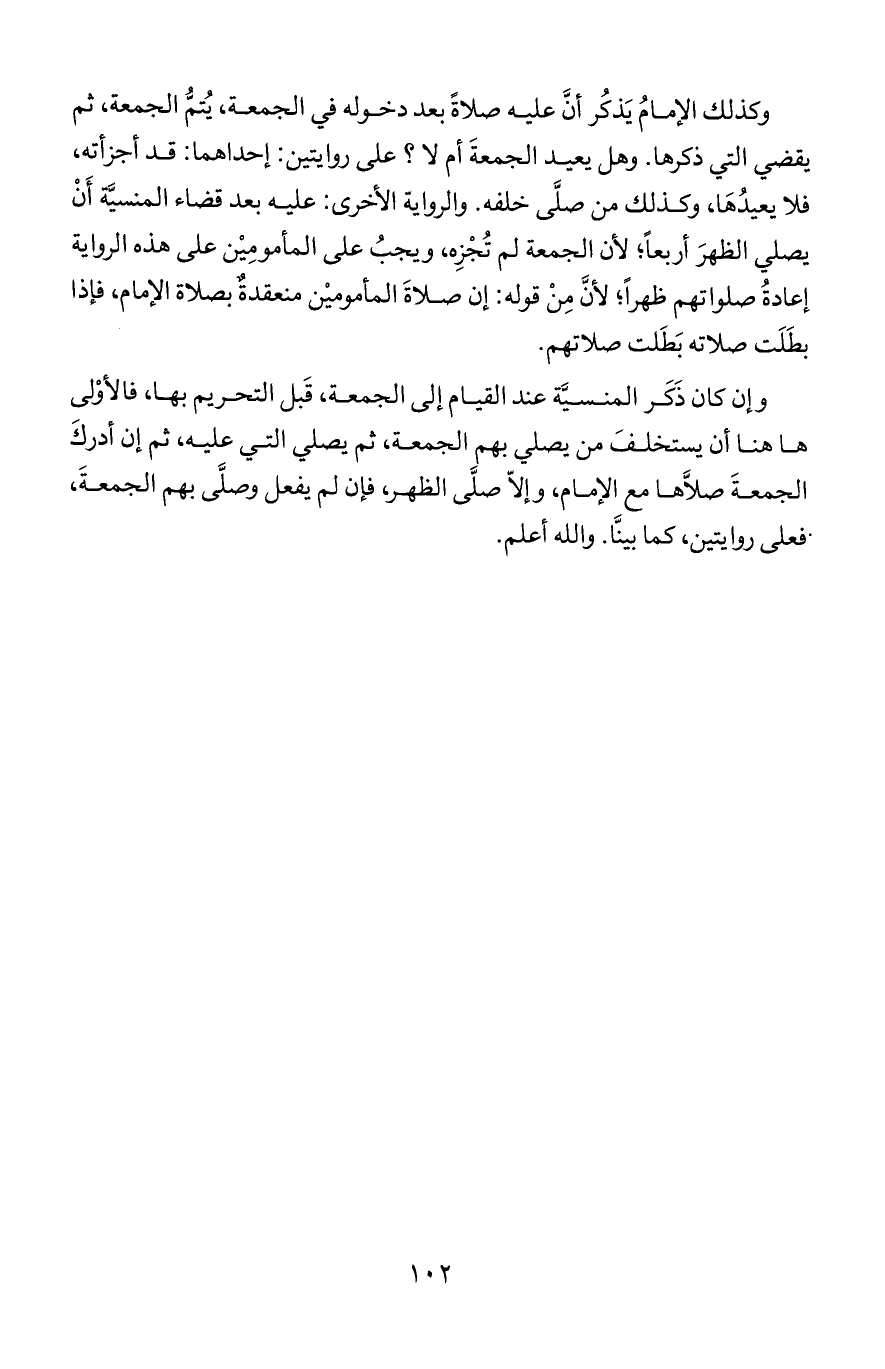 وكذلك الإمام يذكر أن عليه صلاة بعد دخوله في الجمعة يتم الجمعة ثم يقضي التي ذكرها وهل يعيد الجمعة أم لا على روايتين قد أجزأته فلا يعيدها وكذلك من صلى خلفه والرواية الأخرى عليه بعد قضاء المنسية أن يصلي الظهر أربعا لأن الجمعة لم تجزه ويجب على المأمومين على هذه الرواية إعادة صلواتهم ظهرا لأن من قوله إن صلاة المأمومين منعقدة بصلاة الإمام فإذا بطلت صلاته بطلت صلاتهم.