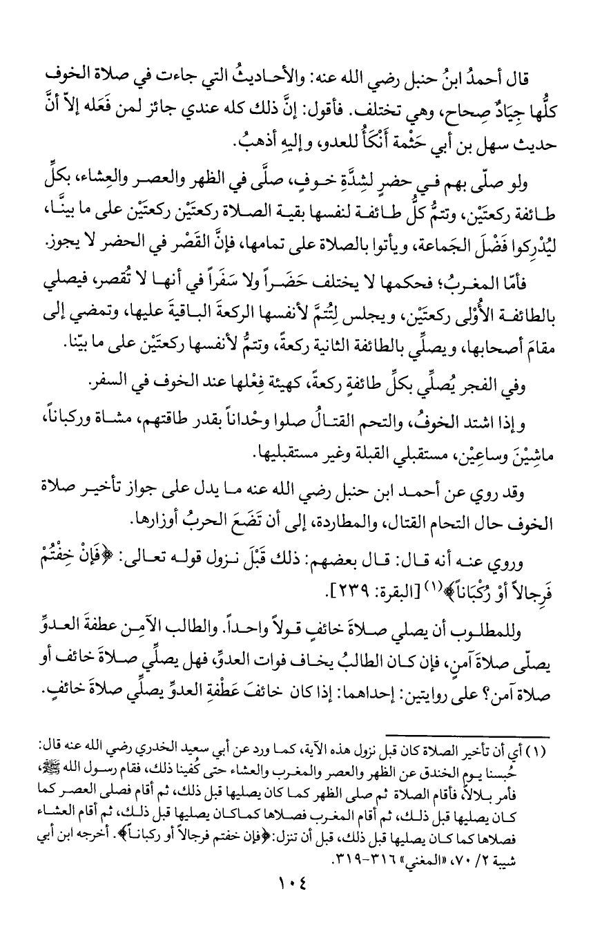 وقد روي عن أحمد ابن حنبل رضي الله عنه مايدل على جواز تأخير صلاة الخوف حال التحام القتال والمطاردة إلى أن تضع الحرب أوزارها.
