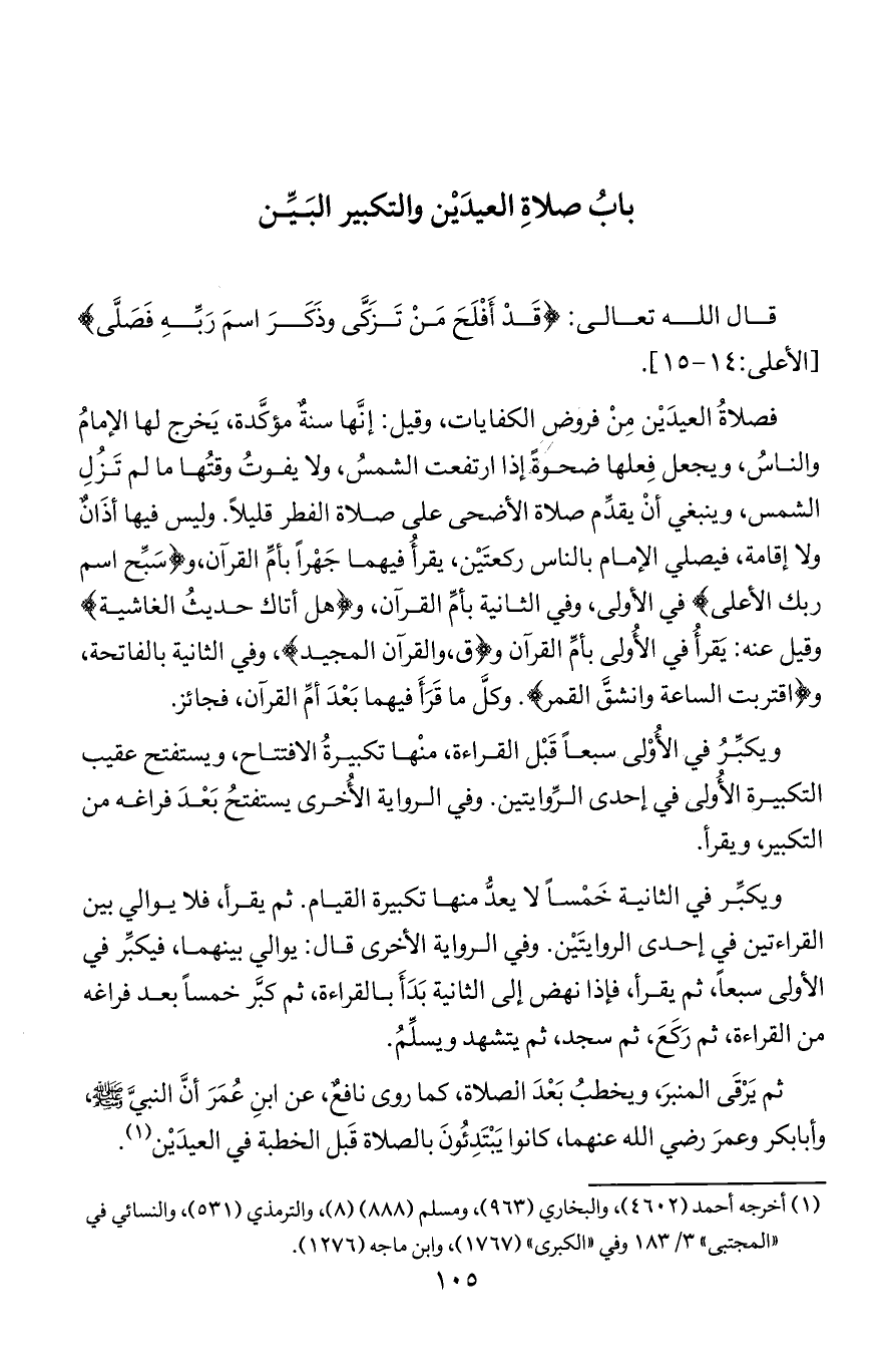 ثم يرقى المنبر ويخطبُ بعد الصلاة كما روى نافع عن ابن عمر أن النبي صلى الله عليه وسلم وأبا بكر وعمر رضي الله عنهما كانو يبتدئون بالصلاة قبل الخطبة في العيدين.