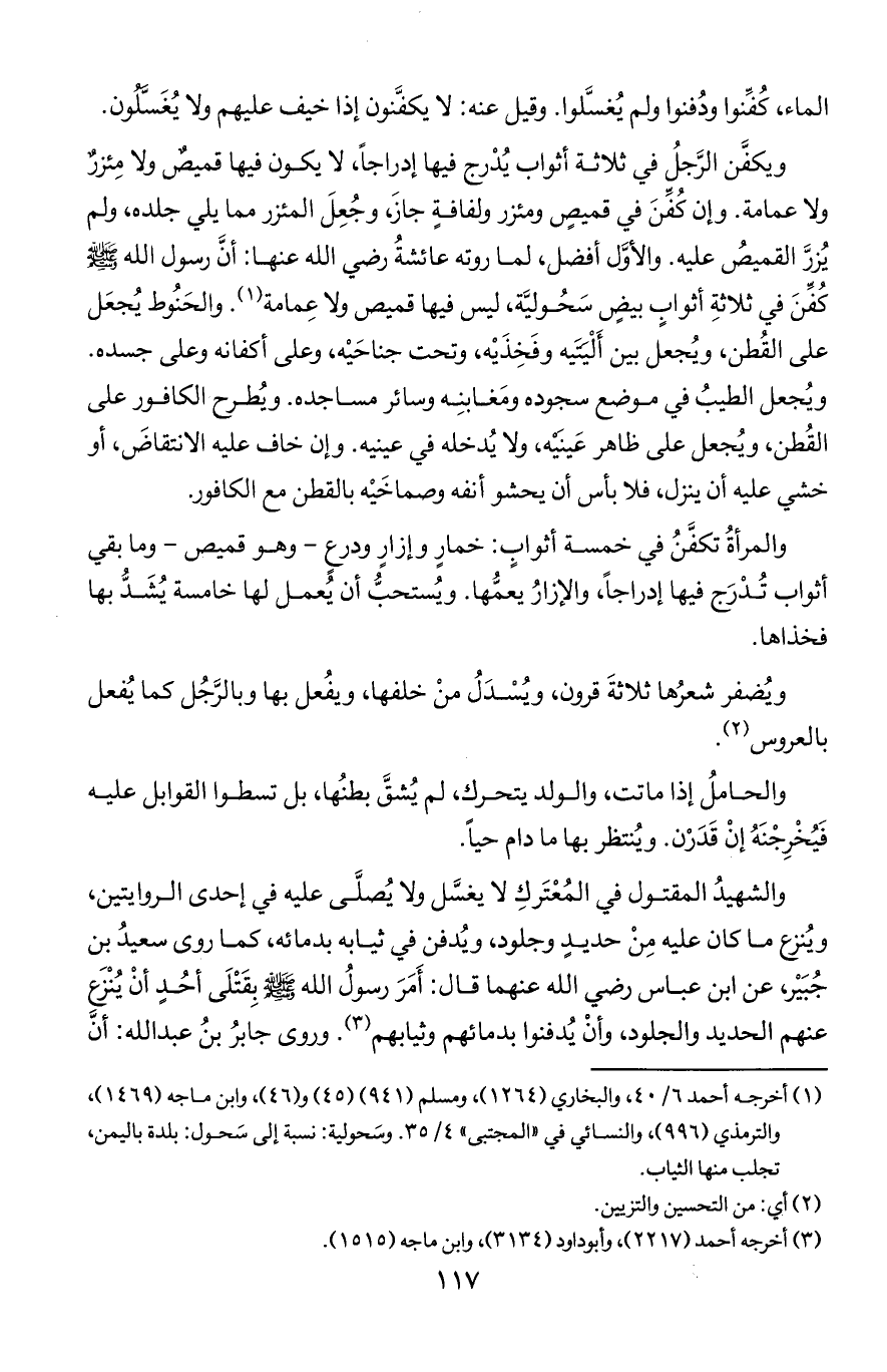 ويكفن الرجل في ثلاثة أثواب يُدرج فيها إدراجا لايكون فيها قميص ولا مئزر ولا عمامة وإن كُفن في قميص ومئزل ولفافة جاز وجُعل المئزر مما يلي جلده ولم يُزر القميصُ عليه والأول أفضل لما روته عائشةُ رضي الله عنها: أن رسول الله صلى الله عليه وسلم كُفن في ثلاثة أثواب بيض سحوليه ليس فيها قميص ولا عمامة والحنوط يُجعل على القُطن ويُجعل بين أليتيه وفخذيه وتحت جناحيه وعلى أكفانه وعلى جسده ويُجعل الطيبُ في موضع سجوده ومعابنه وسائر مساجده ويُطرح الكافور على القُطن ويُجعل على ظاهر عينيه ولا يُدخله في عينيه وإن خاف عليه الانقاض أو خشي عليه أن ينزل فلابأس أن يحشو أنفه وصماخيه بالقطن مع الكافور.