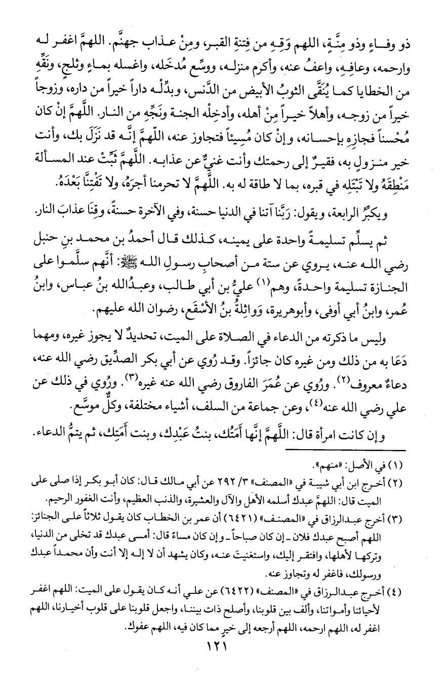 ذو وفاء وذو منه اللهم وقه من فتنة القبر ومن عذاب جهنم اللهم اغفر له وارحمه وعافه واعف عنه وأكرم منزله ووسع مُدخله واغسله بماء وثلج ونقه من الخطايا كما ينقى الثوب الأبيض من الدنس وبدله دارا خيرا من داره وزوجا خيرا من زوجه وأهلا خيرا ن أهله وأدخله الجنة ونجه من النار. اللهم إن كان محسنا فجازه بإحسانه وإن كان مسيئا فتجاوز عنه اللهم إنه قد نزل بك وأنت خير منزول به فقير إلى رحمتك وأنت غني عن عذابه اللهم ثبت عند المسأله منطقة ولاتبتله في قبره بما لا طاقة له به اللهم لاتحرمنا أجره ولا تفتنا بعده.