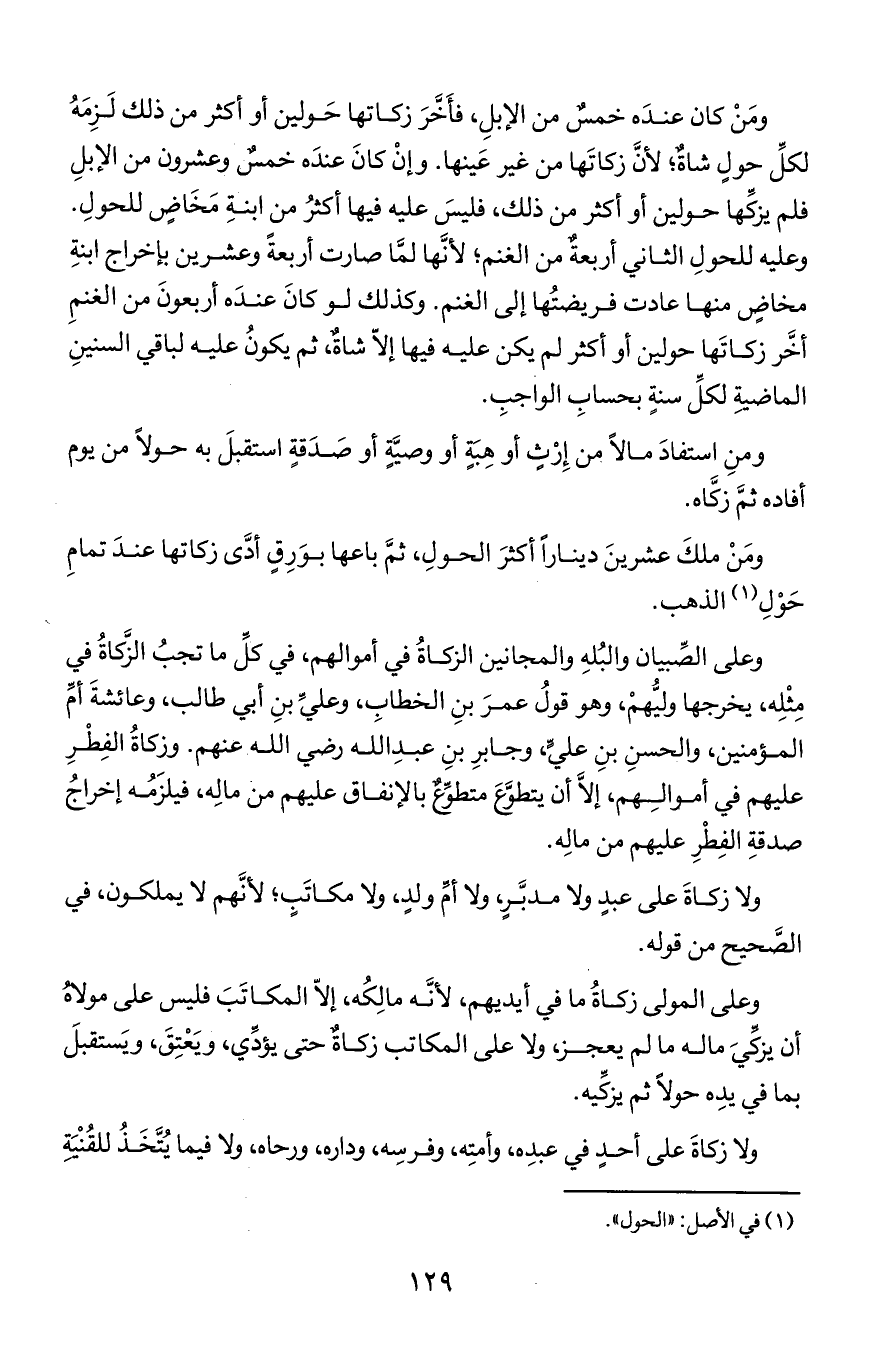 وعلى الصبيان والبله والمجانين الزكاة في أموالهم في كل ما تجب الزكاة في مثله يخرجها وليهم وهو قول عمر بن الخطاب وعلي بن أبي طالب وعائشة أم المؤمنين والحسن بن علي وجابر بن عبدالله رضي الله عنهم وزكاة الفطر عليهم في أموالهم إلا أن يتطوع متطوع بالإنفاق عليهم من ماله فيلزمه إخراج صدقة الفطر عليهم من ماله.