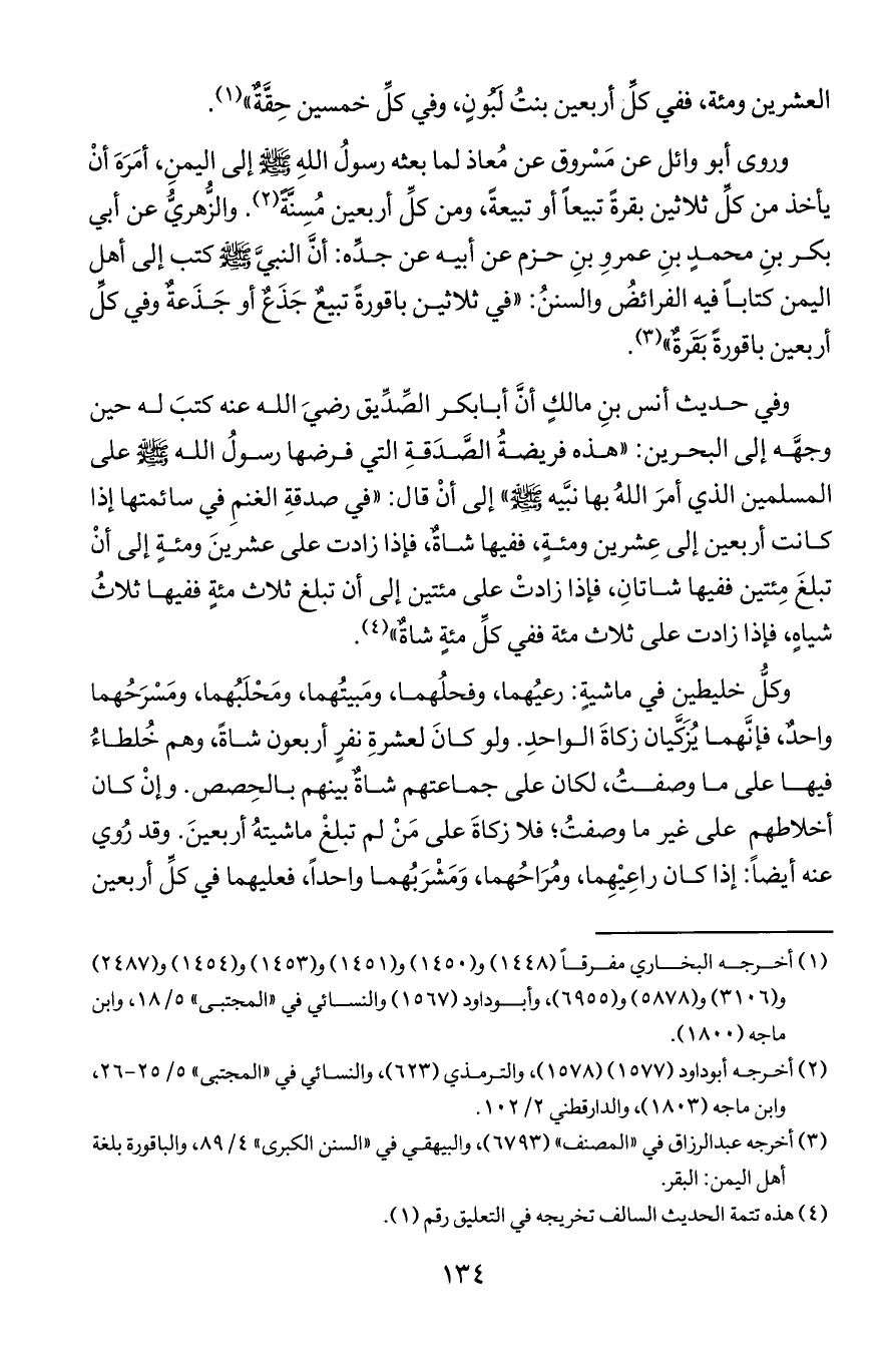 وفي حديث أنس بن مالك أن أبا بكر الصديق رضي الله عنه كتب له حين وجهه إلى البحرين ((هذه فريضة الصدقة التي فرضها رسول الله صلى الله عليه وسلم على المسلمين الذي أمر الله بها نبيه صلى الله عليه وسلم إلى أن قال ((في صدقة الغنم في سائمتها إذا كانت أربعين إلى عشرين ومئة ففيها شاة فإذا زادت على عشرين ومئة إلى أن تبلغ مئتين ففيها شاتان فإذا زادت على مئتين إلى أن تبلغ ثلاث مئة ففيها ثلاث شياه فإذا زادت على ثلاث مئة ففي كل مئة شاة))