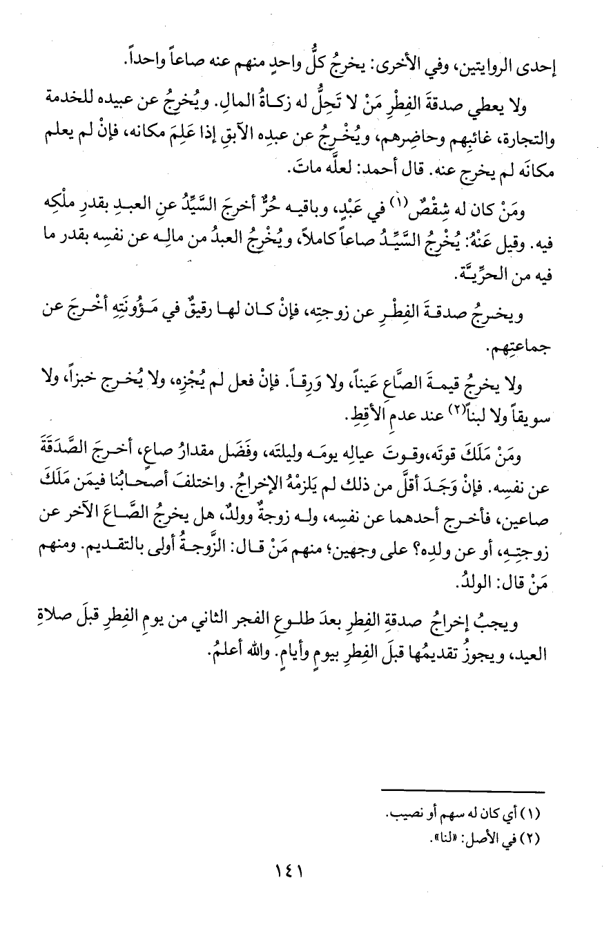 ومن كان له شقص في عبد وباقيه حُرً أخرج السيد عن العبد بقدر ملكه فيه وقيل عنه يُخرج السيد صاعا كاملا ويُخرجُ العبد من ماله عن نفسه بقدر ما فيه من الحرية.