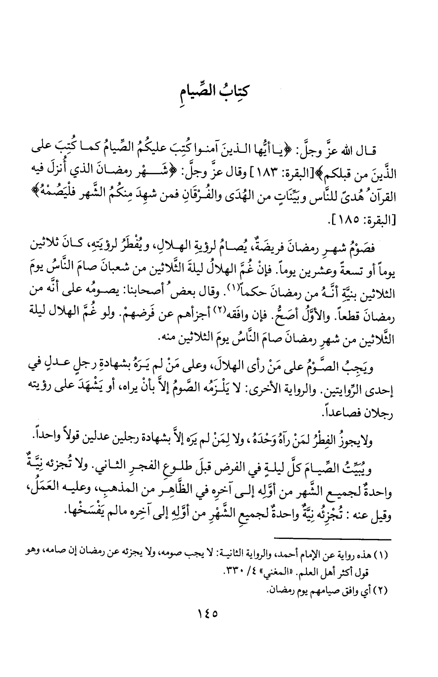 ويجب الصوم على من رأى الهلال وعلى من لم يره بشهادة رجل عدل في إحدى الروايتين والرواية الأخرى لا يلزمه الصوم إلا بأن يراه أو يشهد على رؤيته رجلان فصاعدا.
