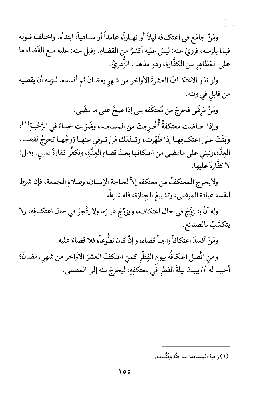 ولا يخرج المعتكف من معتكفة إلا لحاجة الإنسان وصلاة الجمعة فإن شرط لنفسه عيادة المرضى وتشييع الجنازة فله شرطه.