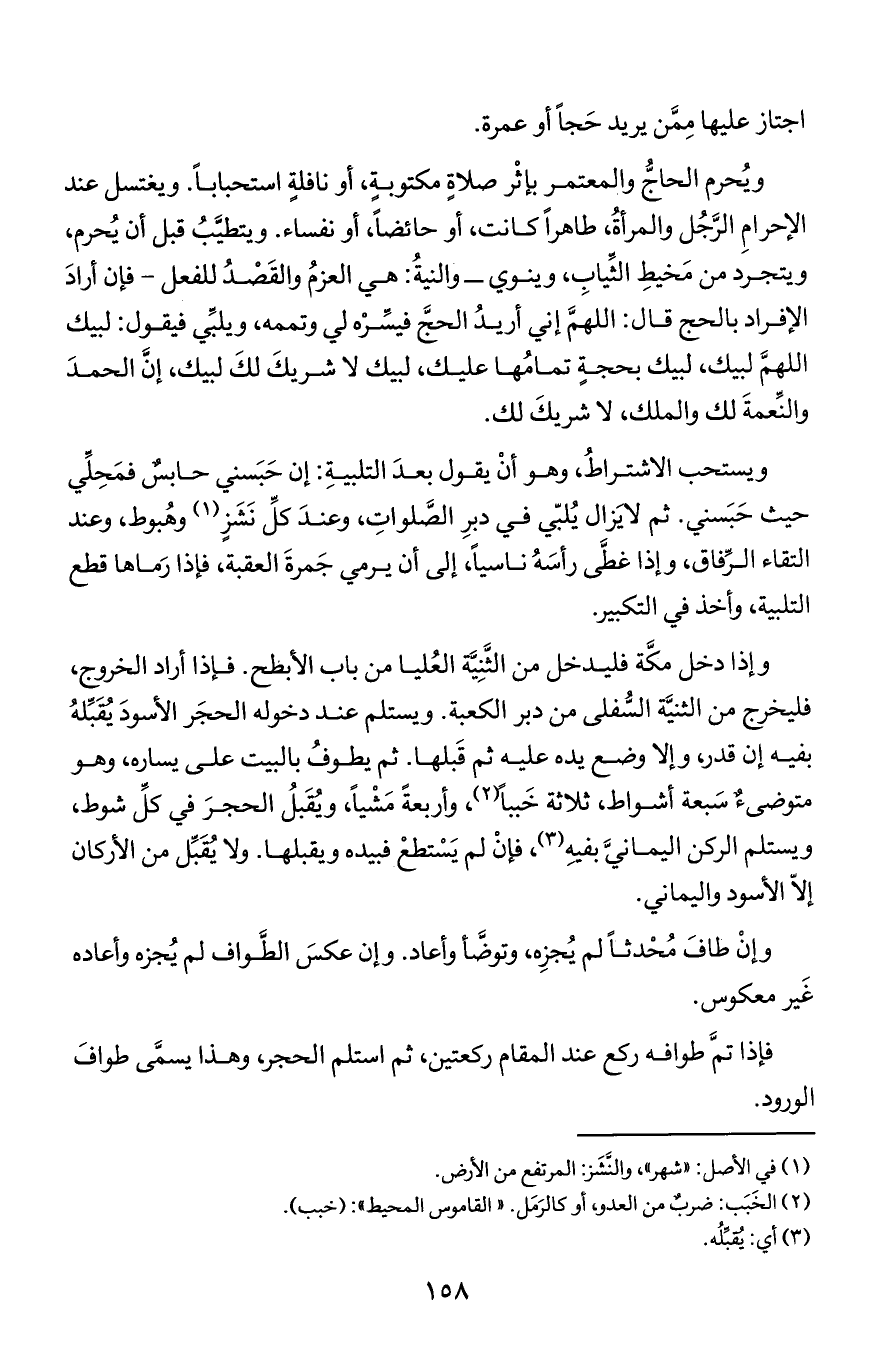 ويحرم الحاج والمعتمر بإثر صلاة مكتوبة أو نافلة استحبابا ويغتسل عند الإحرام الرجُل والمرأة طاهرا كانت أو حائضا أو نفساء ويتطيب قبل أن يحرم ويتجرد من مخيط الثياب وينوي – والنية هي العزم والقصد للفعل – فإن أراد الإفراد بالحج قال اللهم إني أريد الحج فيسره لي وتممه ويلبي فيقول لبيك الله اللهم لبيك لبيك بحجة تمامها عليك لبيك لاشريك لك لبيك إن الحمد والنعمة لك والملك لا شريك لك.