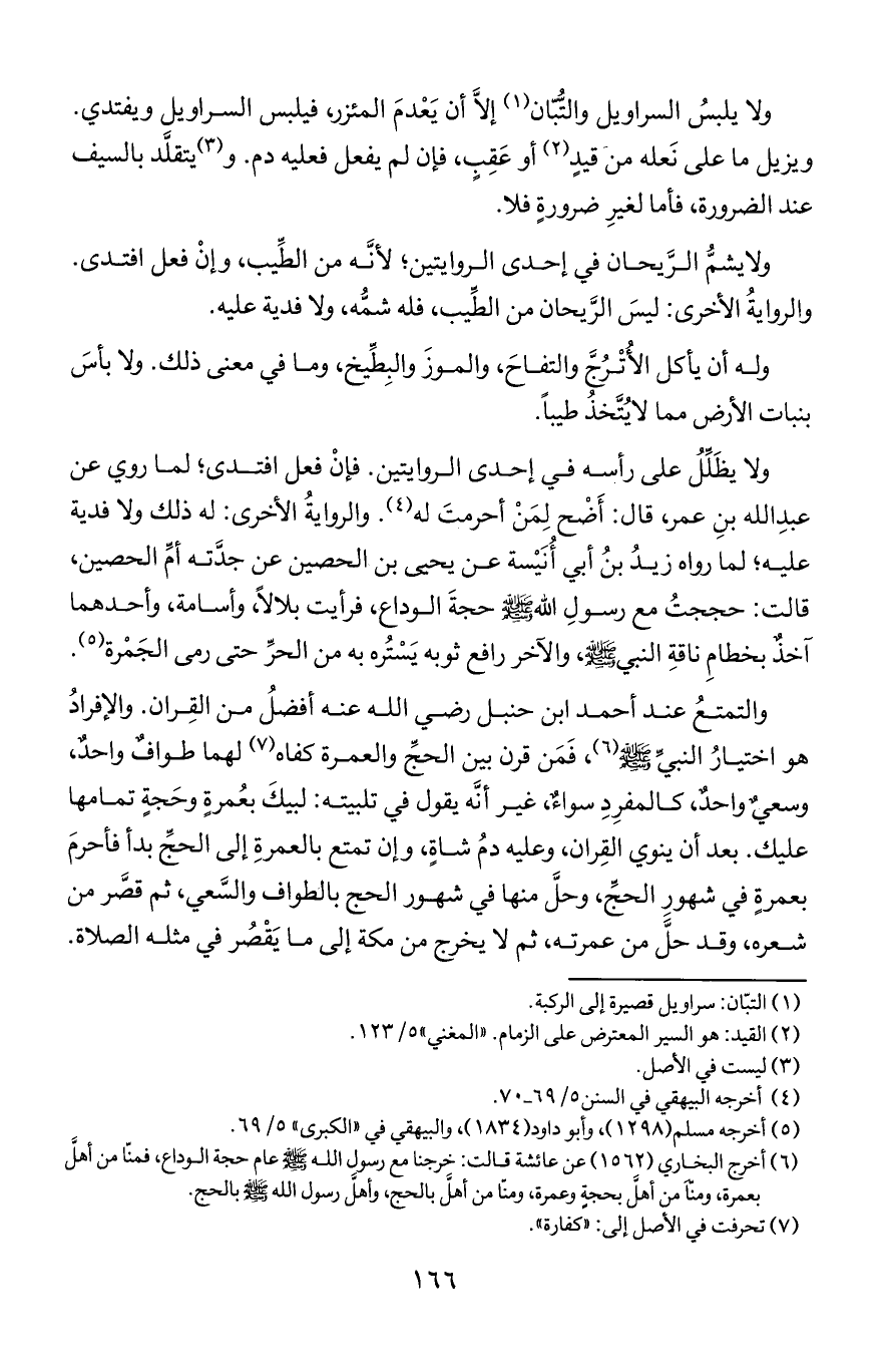 ولا يلبس السراويل والتُبان إلا أن يعدم المئزر فيلبس السروايل ويفتدي ويزيل ما على نعله من قيد أو عقب فإن لم يفعل فعليه دم ويتقلد بالسيف عند الضرورة فأما لغير ضرورة فلا.