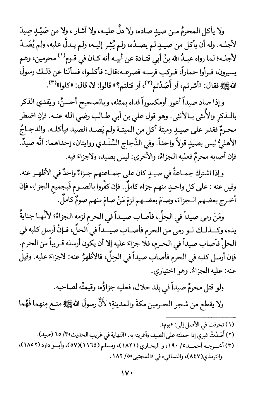 ولا يأكل المحرمُ م صيد صاده ولا دل عليه ولا أشار ولا من صيدٍ صيدَ لأجله وله أن يأكل من صيد لم يصده ولم يُشر إليه ولم يدل عليه ولم يُصد لأجله لما رواه عبدالله بن أبي قتادة عن أبيه أنه كان في قوم محرمين وهم يسيرون فرأوا حمارا فركب فرسه فصرعه قال: فأكلوا فسألنا عن ذلك رسول الله صلى الله عليه وسلم فقال ((أشرتم أو أصدتم أو قتلتم؟)) قالوا لا قال كلوا)).