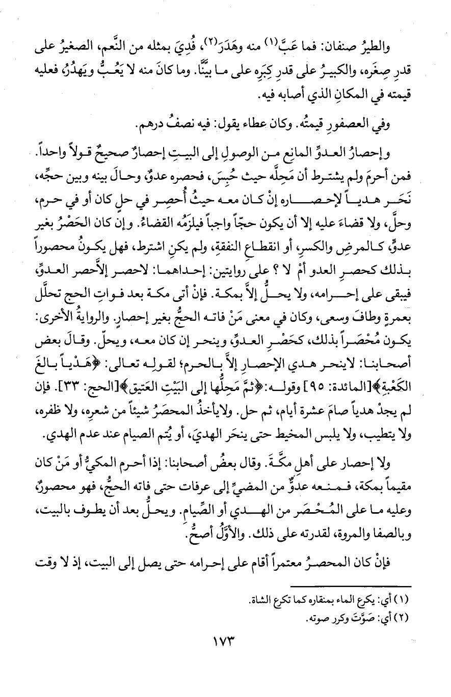 وإحصار العدو المانع من الوصول إلى البيت إحصار صحيح قولا واحدا. فمن أحرم ولم يشترط أن محله حيث حُبس فحصره عدوٌ وحال بينه وبين حجه تحر هديا لإحصاره إن كان معه حيث أحصر في حل كان أو في حرم وحل ولا قضاء عليه إلا أن يكون حجا واجبا فيلزمه القضاء وإن كان الحصر بغير عدو كالمرض والكسر أو انقطاع النفقة ولم يكن اشترط فهل يكون محصورا بذلك كحصر العدو أم لا؟ على روايتين إحداهما: لاحصر إلا حصر العدو فيبقى على إحرامه ولا يحل إلا بمكة فإن أتب مكة بعد فوات الحج تحلل بعمرة وطاف وسعى وكان في معنى من فاته الحج بغير إحصار والرواية الأخرى: يكون مُحصرا بذلك كحصر العدو وينحر إن كان معه ويحل وقال بعض أصحابنا لاينحر هدي الإحصار إلا بالحرم لقوله تعالى (هديا بالغ الكعبة) المائدة 95) وقوله (ثم محلها إلى البيت العتيق) الحج 33) فإن لم يجد هديا صام عشرة أيام ثم حل ولا يأخذ المحصر شيئا من شعره ولا ظفره ولا يتطيب ولا يلبس المخيط حتى ينحر الهدي أو الصيام ويحل بعد أن يطوف بالبيت وبالصفا والمروة لقدرته على ذلك والأول أصح.
