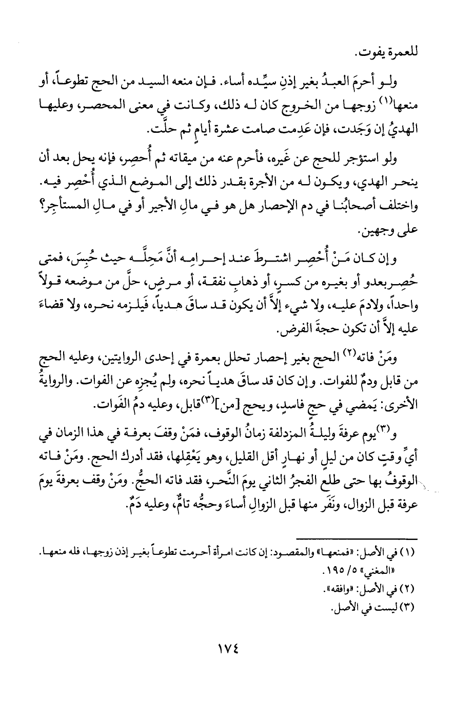 ومن فاته الحج بغير إحصار تحلل بعمرة في إحدى الروايتين وعليه الحج من قابل ودم للفوات وإن كان قد ساق هديا نحره ولم يُجزه عن الفوات والرواية الأخرى يمضي في حج فاسد ويحج (من) قابل وعليه دم الفوات.