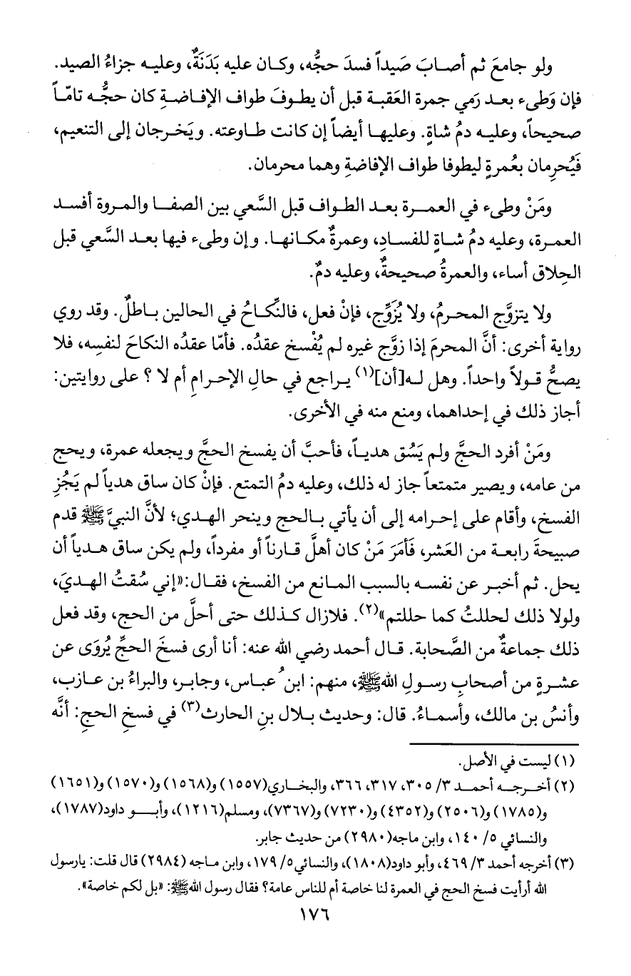 ومن أفرد الحج ولم يسق هديا فأحب أن يفسخ الحج ويجعله عمرة ويحج من عامه ويصير متمتعا جاز له ذلك وعليه دم التمتع فإن كان ساق هديا لم يجز الفسخ وأقام على إحرامه إلى أن يأتي بالحج وينحر الهدي لأن النبي صلى الله عليه وسلم قدم صبيحة رابعة من العشر فأمر من كان أهل قارناأو مفردا ولم يكن ساق هديا أن يحل ثم أخبر عن نفسه بالسبب المانع من الفسخ فقال ((إني سقت الهدي ولو ذلك لحللت كما حللتم)) فلا زال كذلك حتى أحل من الحج وقد فعل ذلك جماعة من الصحابة قال أحمد رضي الله عنه أنا أرى فسخ الحج يُروى عن عشرة من أصحاب رسول الله صلى الله عليه وسلم منهم: أبن عباس وجابر والبراء بن عازب وأنس بن مالك وأسماء قال وحديث بلال بن الحارث في فسخ الحج أنه