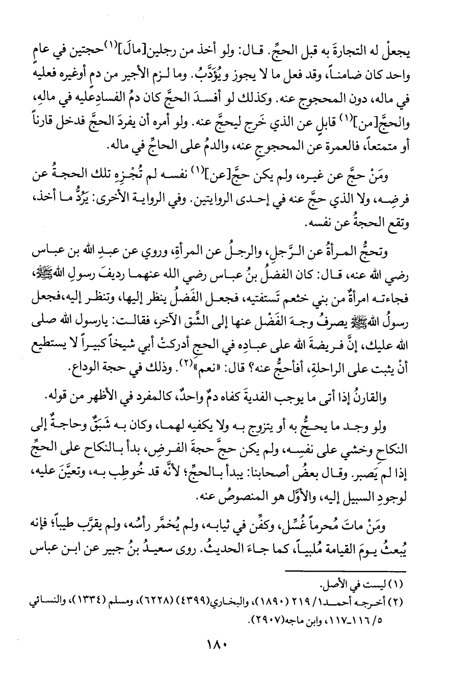 يجعل له التجارة به قبل الحج قال ولو أخذ من رجلين (مال) حجتين في عام واحد كان ضامنا وقد فعل مالا يجوز ويُؤدب وما لزم الأجير من دم أو غيره فعليه في ماله دون المحجوج عنه وكذلك لو أفسد الحج كان دم الفساد عليه في ماله والحج (من) قابل عن الذي خرج ليحج عنه ولو أمره أن يفرد الحج فدخل قارنا أو متمتعا فالعمرة عن المجوج عنه والدم على الحاج في ماله.