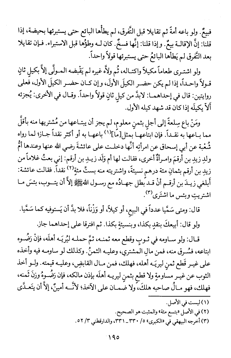 ومن باع سلعة إلى أجل بثمن معلوم لم يجز أن يبتاعها من ُمشتريها منه بأقل مما باعها به نقدا فإن ابتاعها بمثل (ما) باعها به أو أكثر نقدا جاز لما رواه شعبة عن أبي إسحاق عن امرأته أنها دخلت على عائشة رضي الله عنها وعندها أم ولد زيد بن أرقم وامرأة أخرى فقالت لها أم ولد زيد بن أرقم: إني بعت غلاما من زيد بن أرقم بثمان مئة درهم نسيئة واشتريته منه بست مئة نقدا فقالت عائشة أبلغي زيد بن أرقم أن قد بطل جهاده مع رسول الله صلى الله عليه وسلم إلا أن يتوب بئس ما اشتريت وبئس ما اشترى.