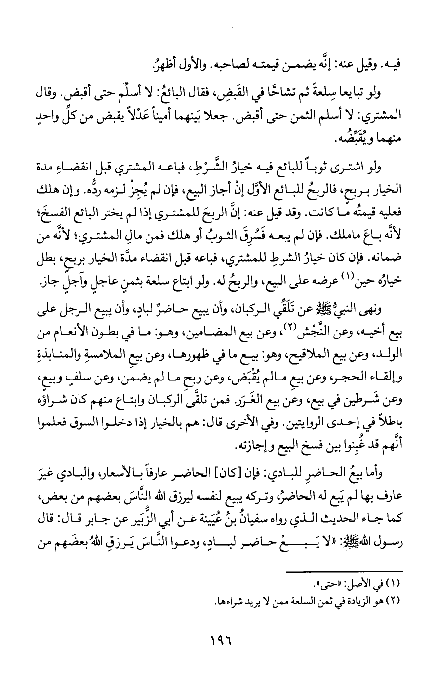 وأما بيع الحاضر للبادي فإن (كان) الحاضر عارف بالأسعار والبادي غير عارف بها لم يبع له الحاضر وتركه يبيع لنفسه ليرزقا لله الناس بعضهم من بعض كما جاء الحديث الذي رواه سفيان بن عيينة عن أبي الزبير عن جابر قال قال رسول الله صلى الله عليه وسلم (لايبع حاضر لباد ودعوا الناس يرزق الله بعضهم من