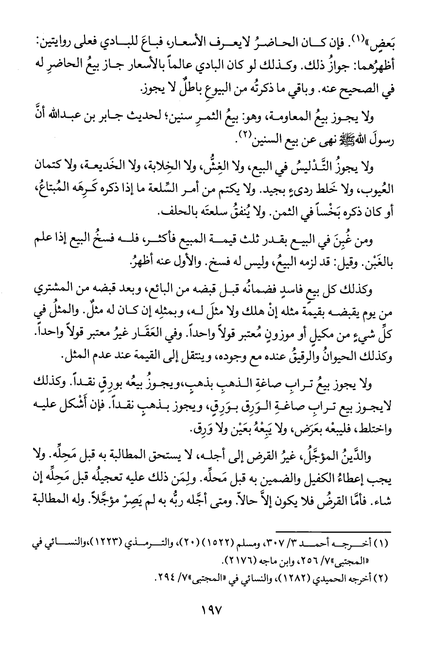 بعض) فإن كان الحاضر لايعرف الأسعار فباع للبادي فعلى روايتين أظهرهما جواز ذلك وكذلك لو كان البادي عالما بالأسعار جاز بيع الحاضر له في الصحيح عنه وباقي ماذكرته من البيوع باطل لايجوز.